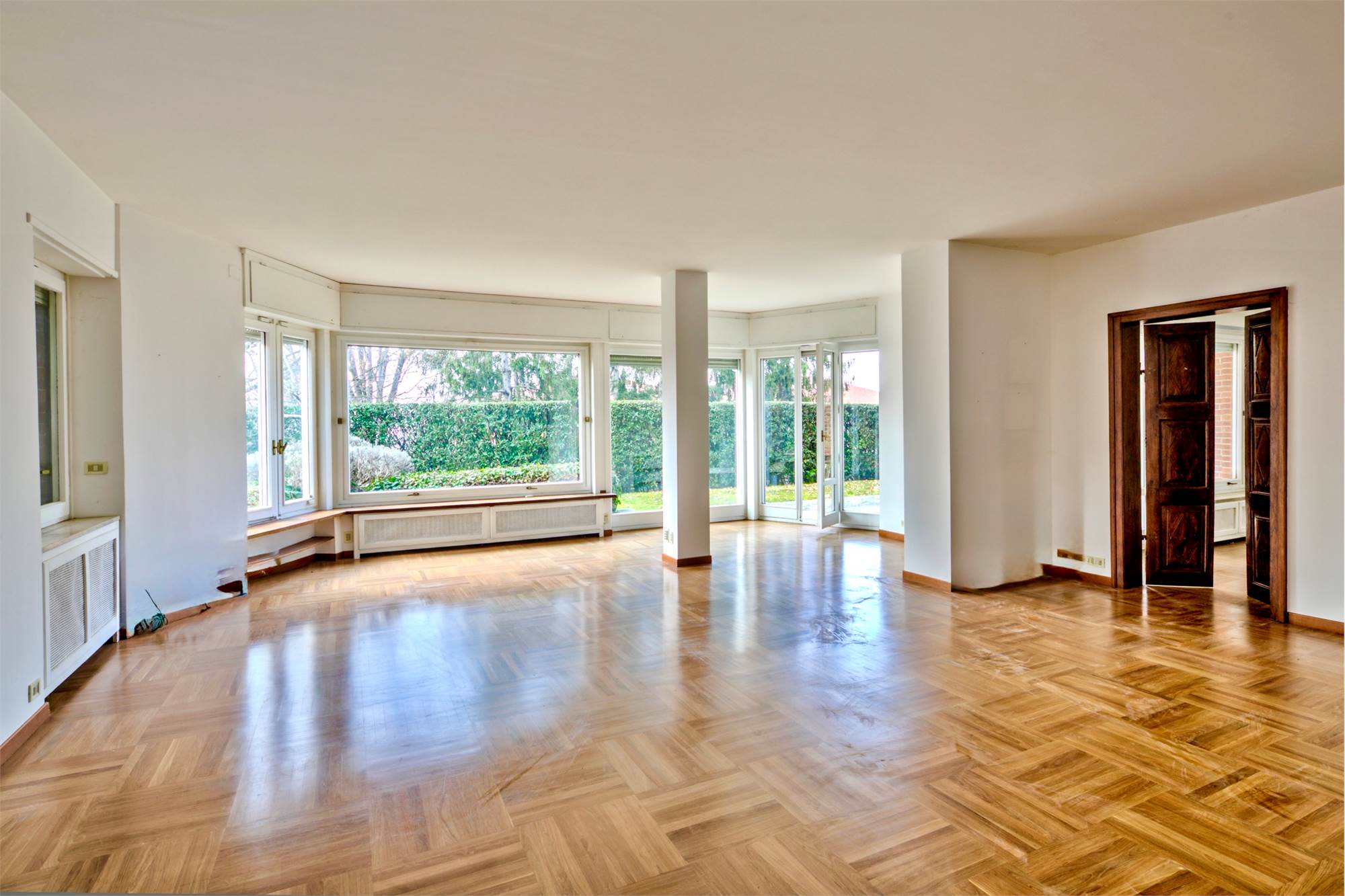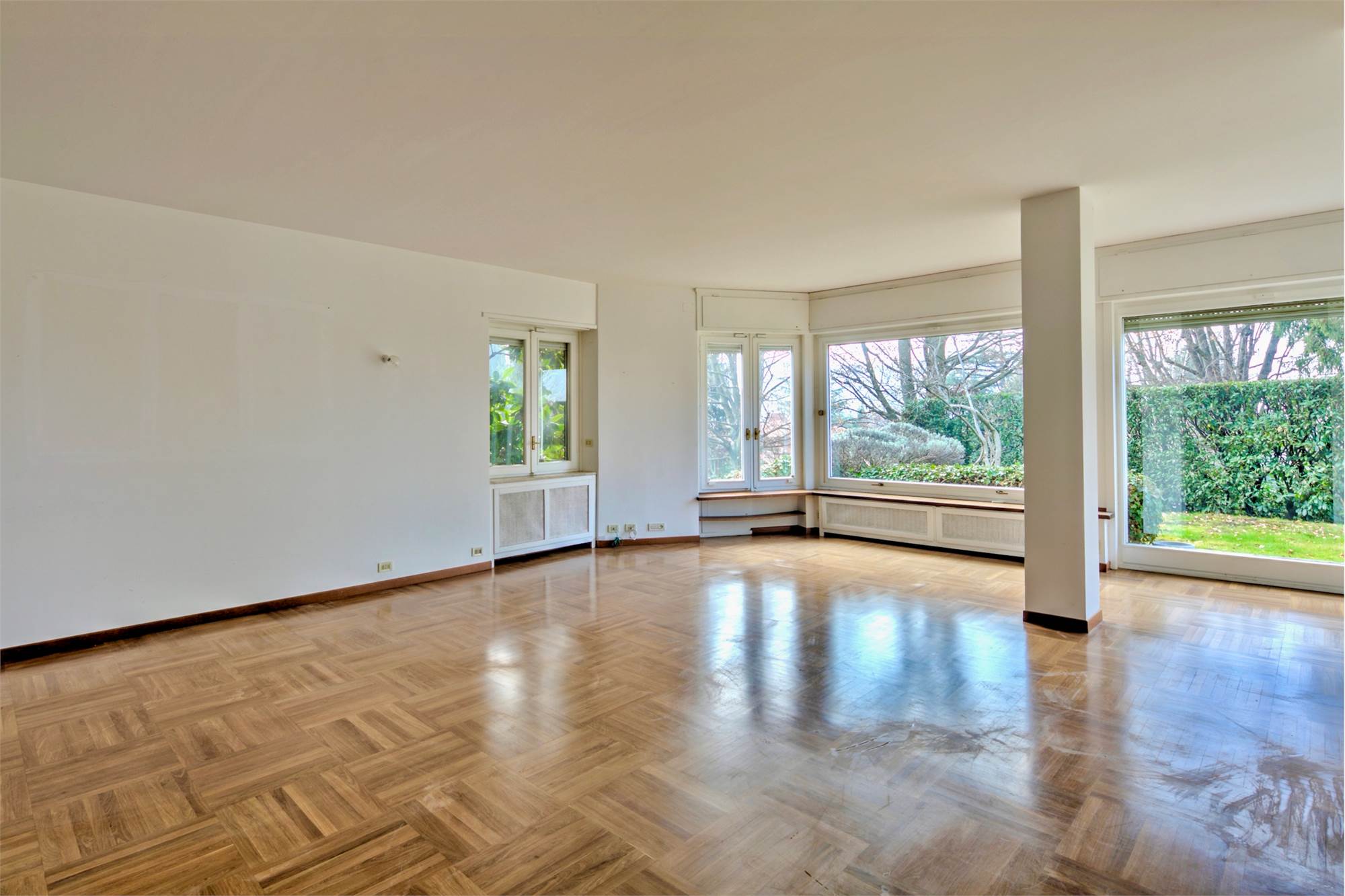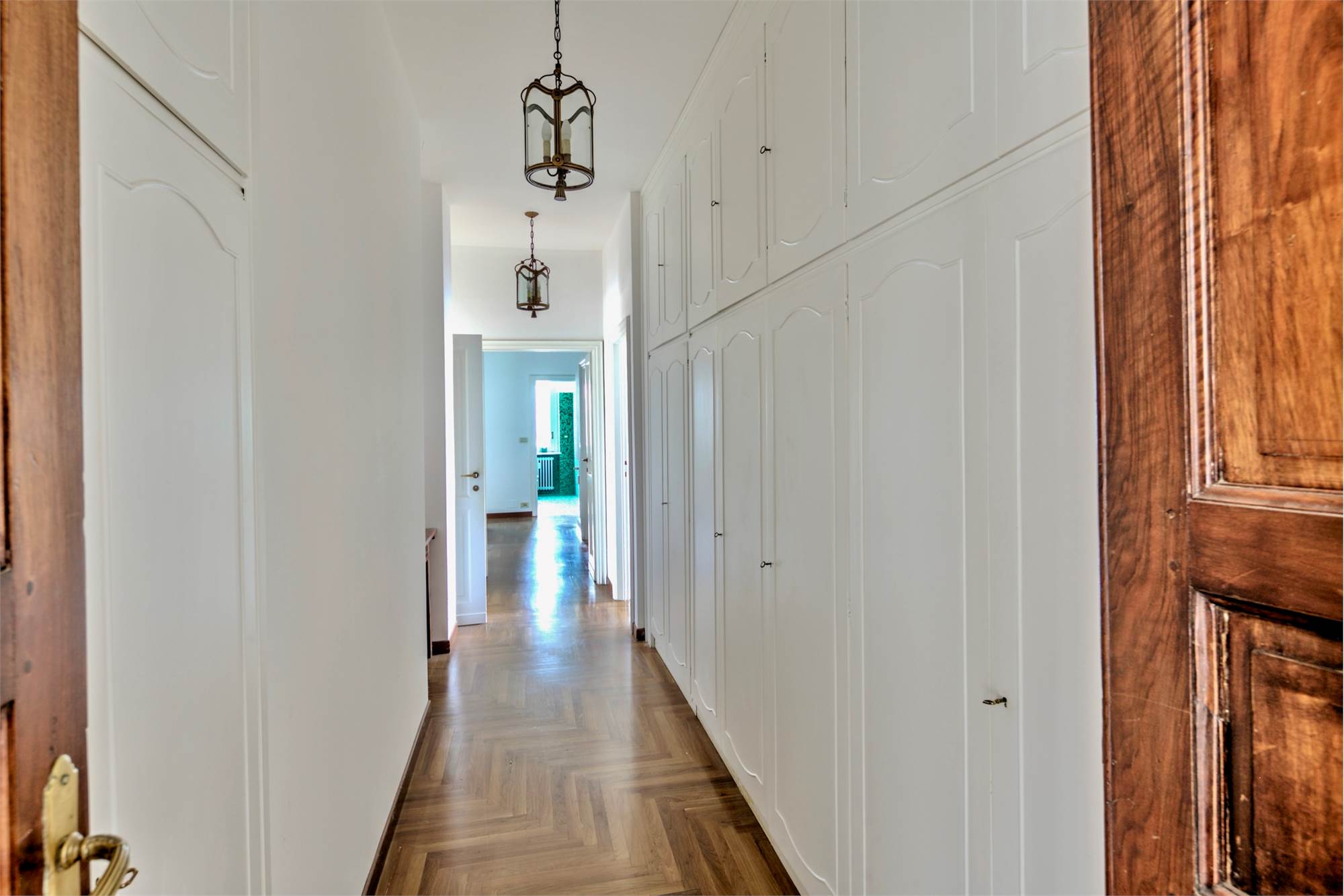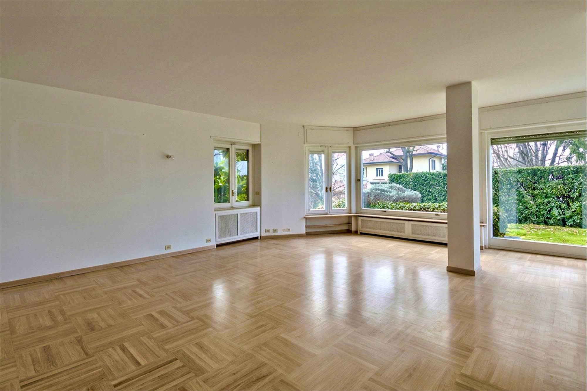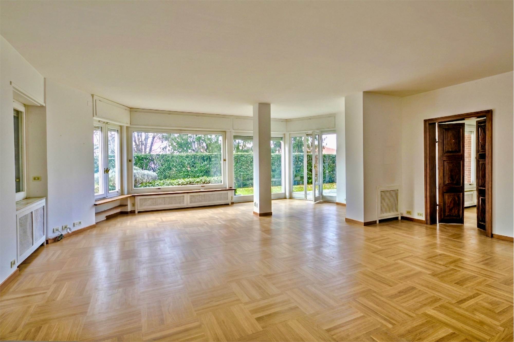 L'appartement, d'environ 330 mètres carrés, se distingue par la luminosité des pièces et la distribution harmonieuse des espaces. Le cœur de la maison est un grand salon double avec cheminée, agrémenté de larges ouvertures sur le magnifique jardin plat privé, parfait pour des moments de détente, de réception et de convivialité. La zone jour est complétée par une salle à manger et une grande cuisine moderne, éventuellement meublée.