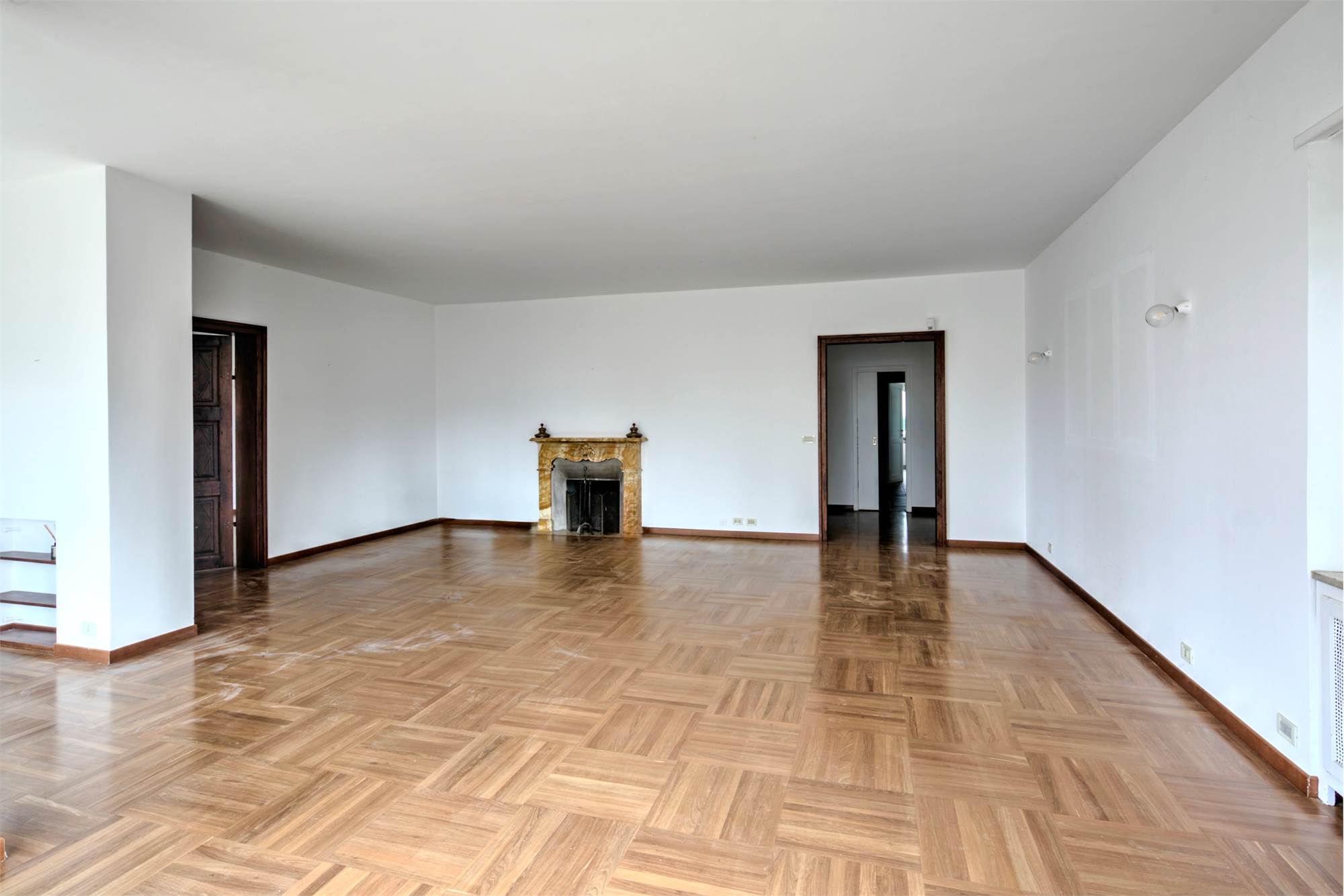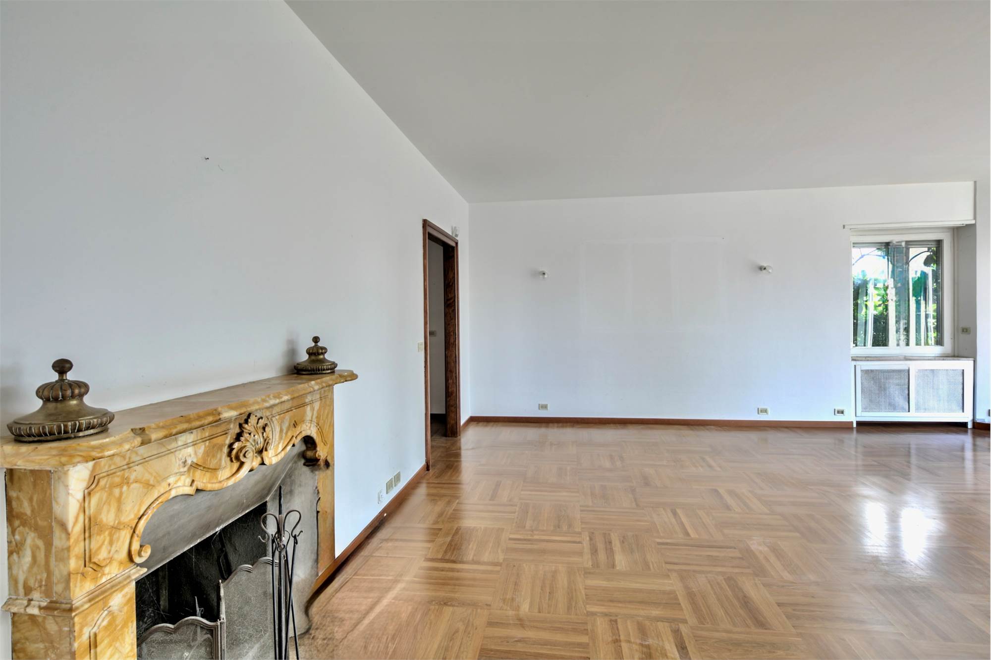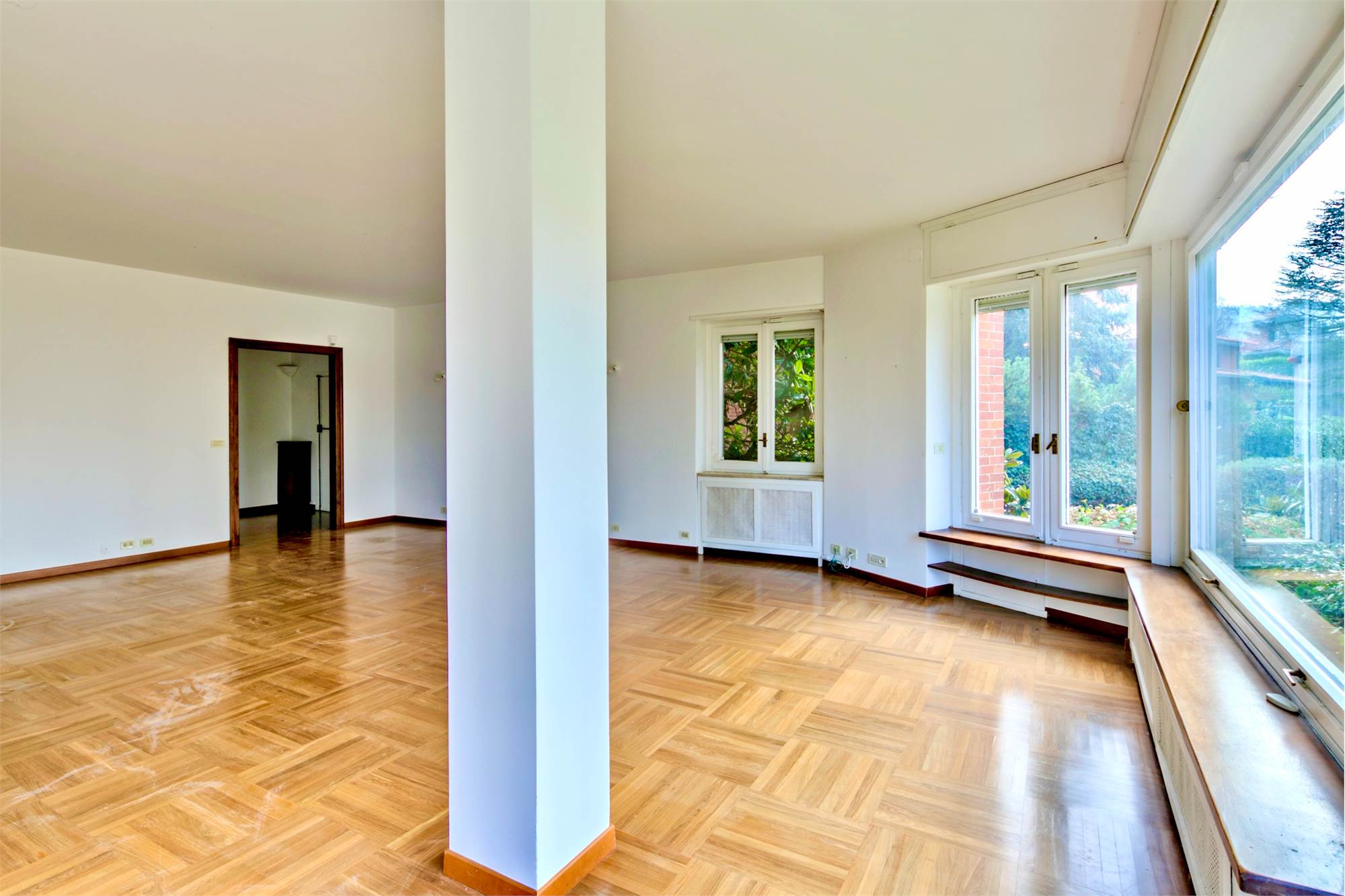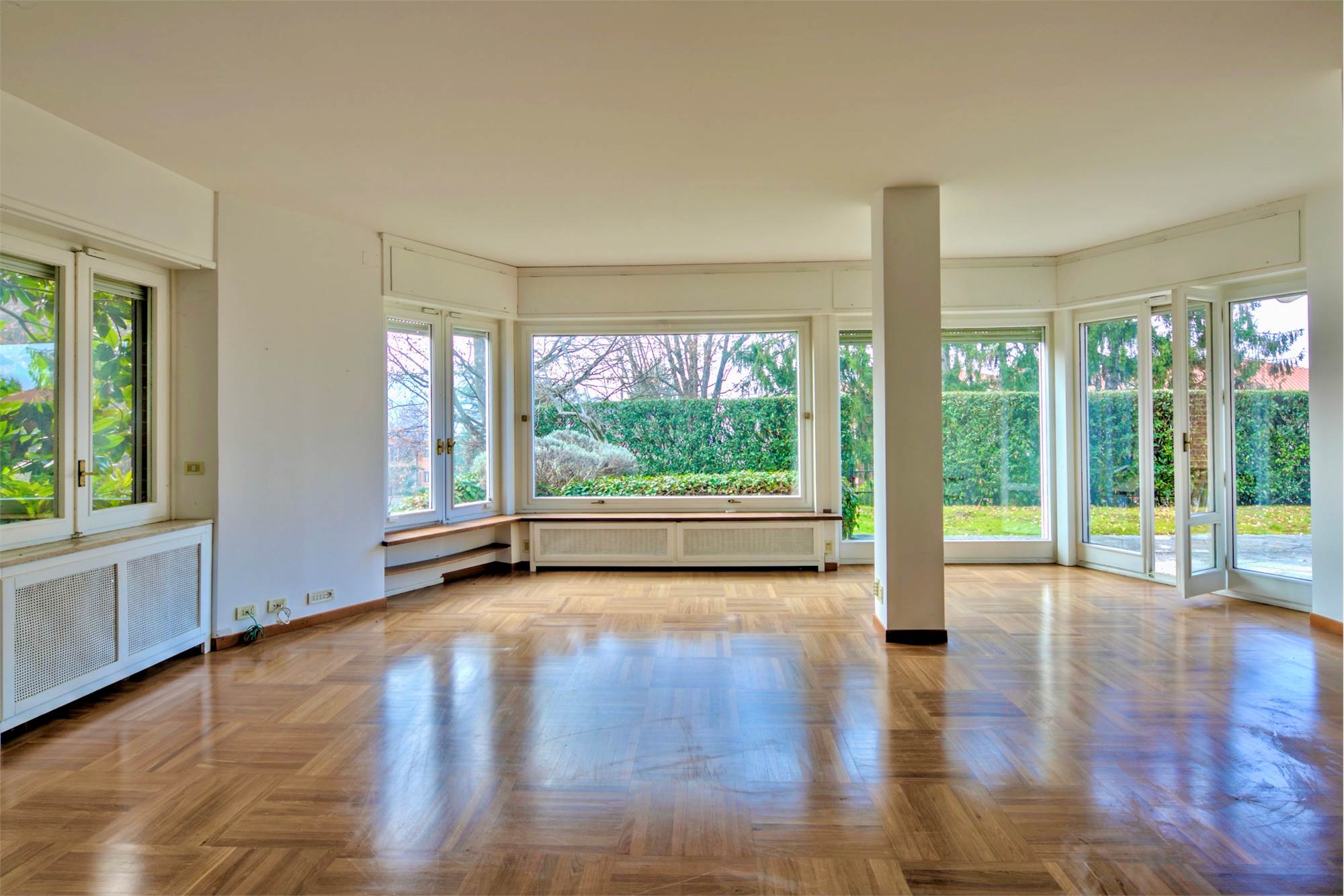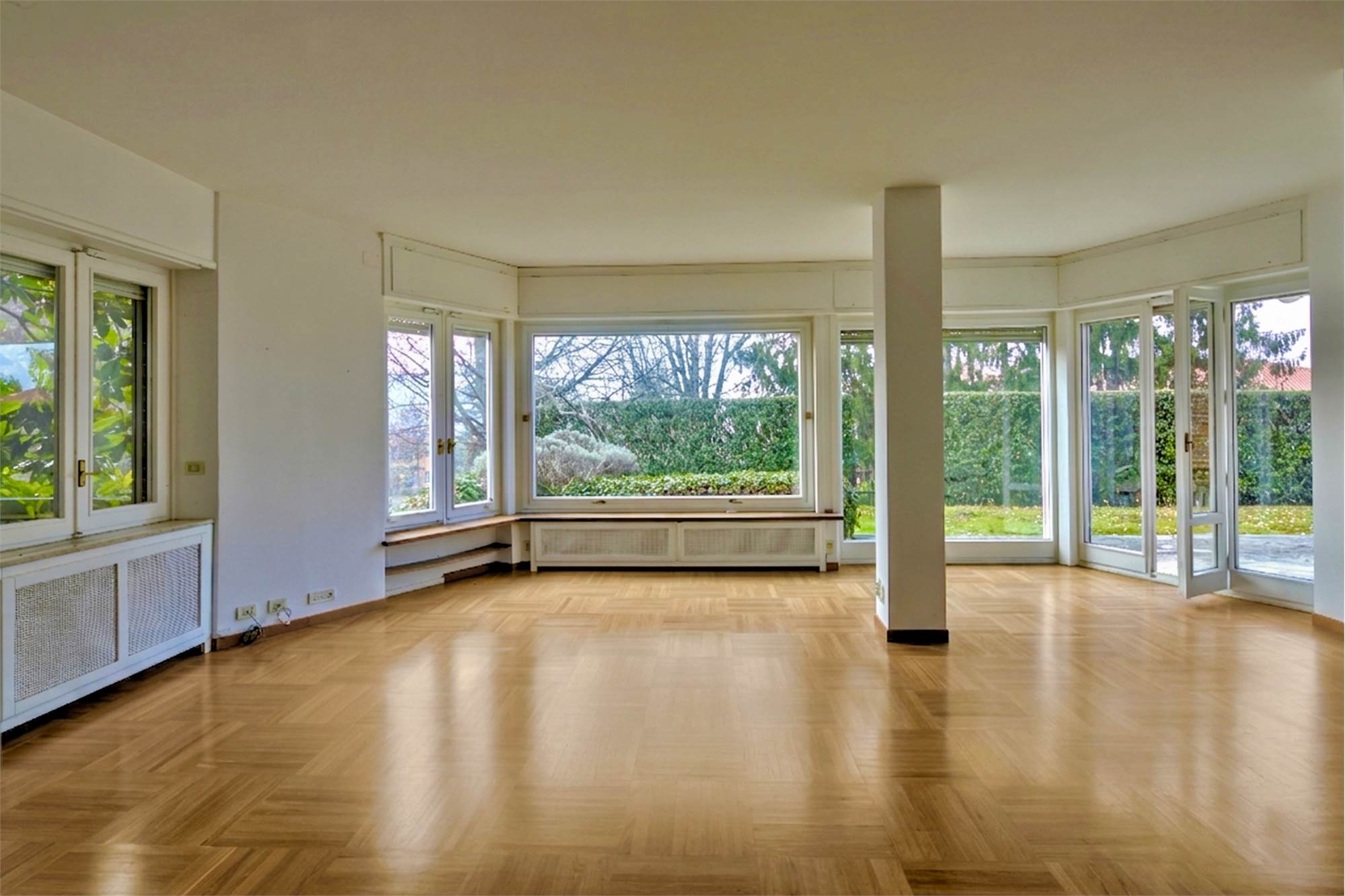 L'appartement, d'environ 330 mètres carrés, se distingue par la luminosité des pièces et la distribution harmonieuse des espaces. Le cœur de la maison est un grand salon double avec cheminée, agrémenté de larges ouvertures sur le magnifique jardin plat privé, parfait pour des moments de détente, de réception et de convivialité. La zone jour est complétée par une salle à manger et une grande cuisine moderne, éventuellement meublée.