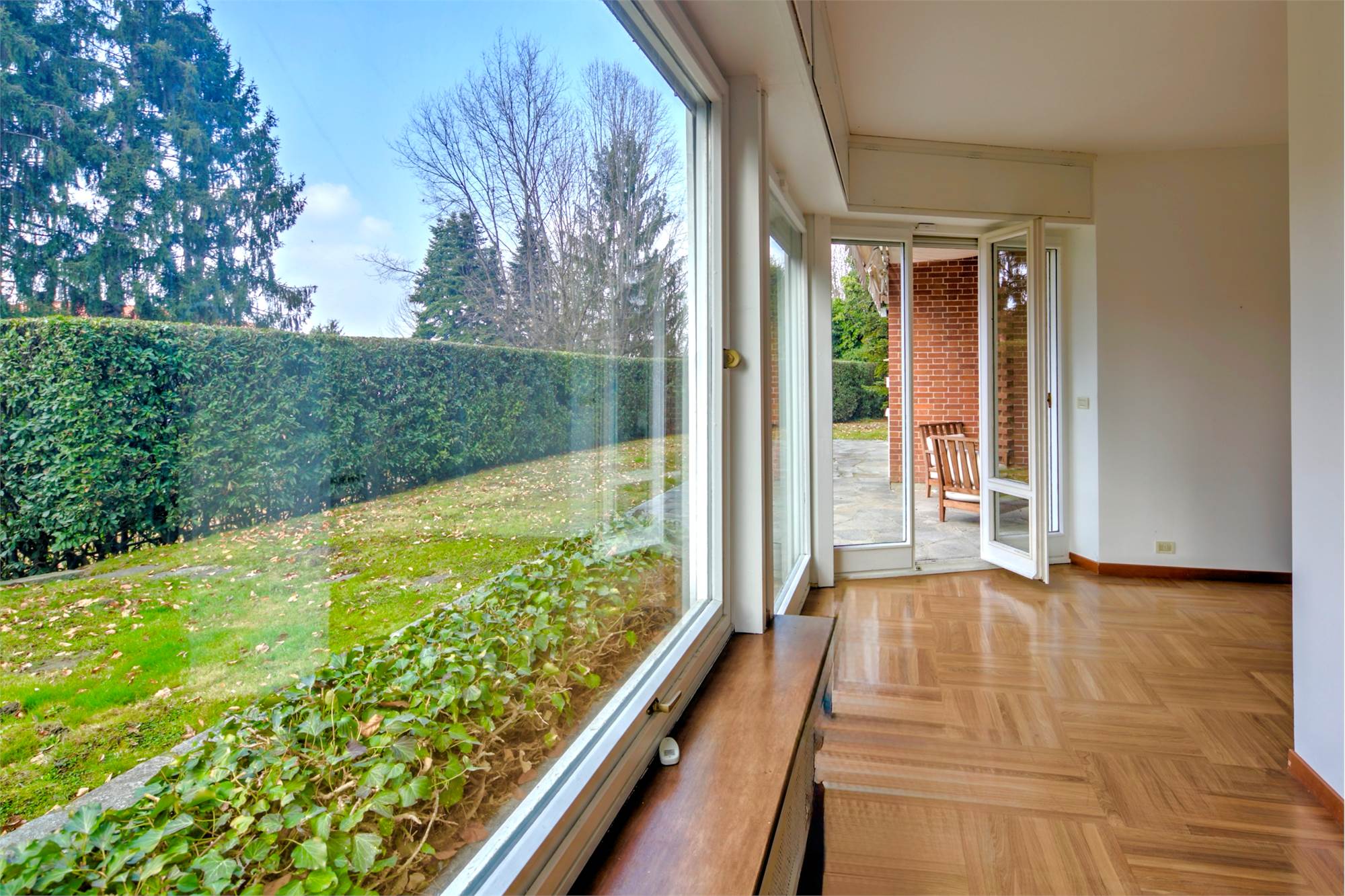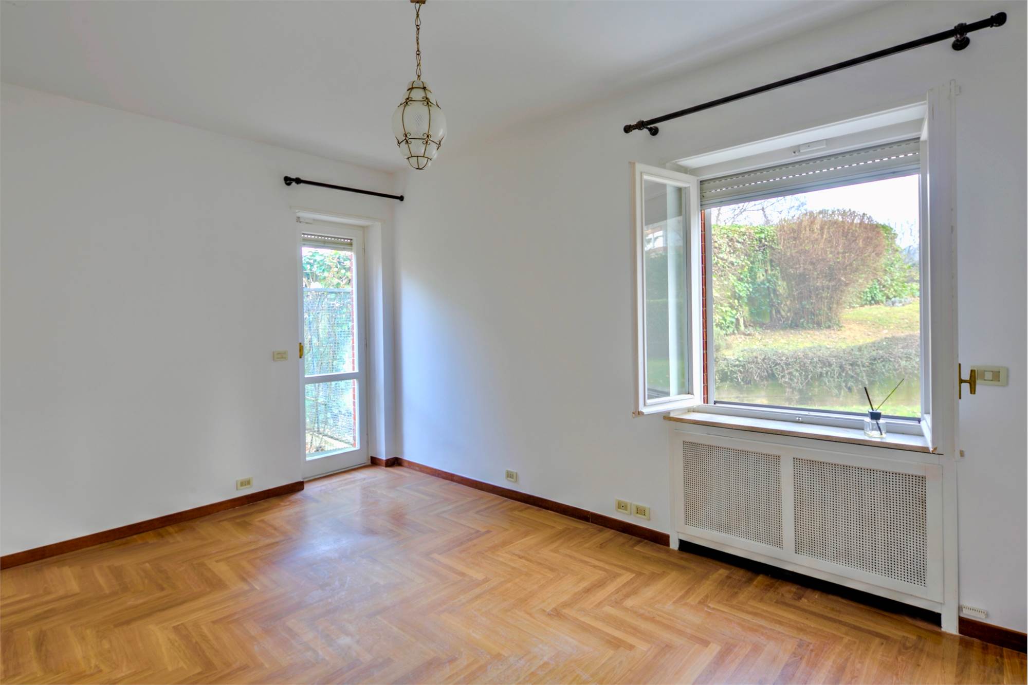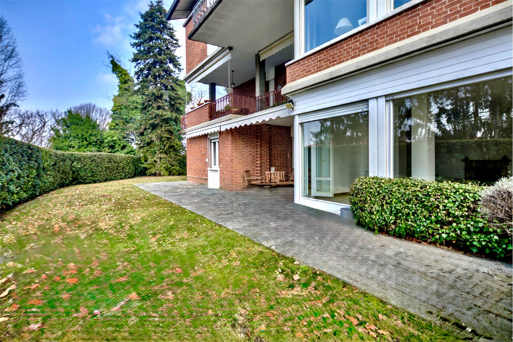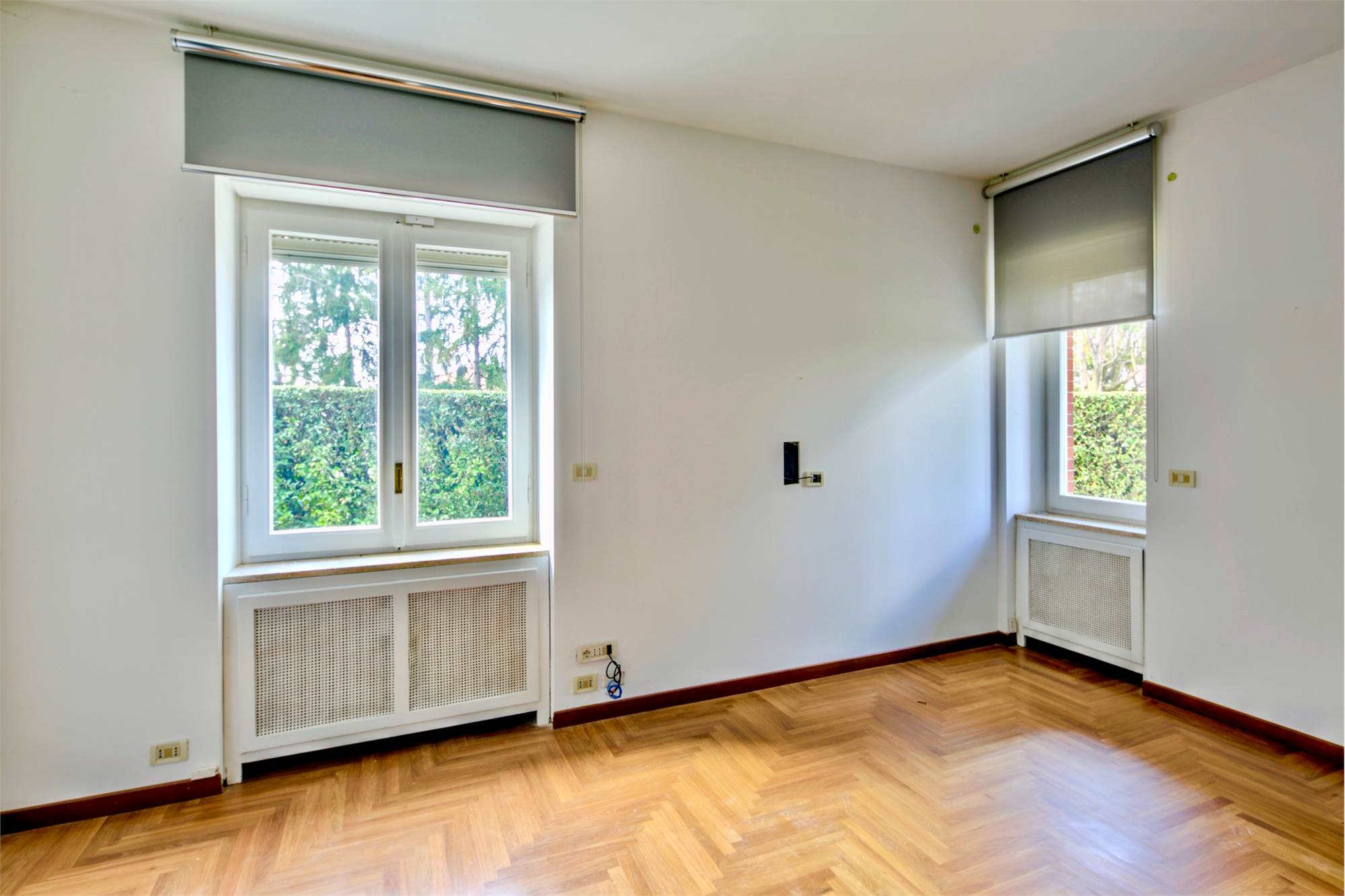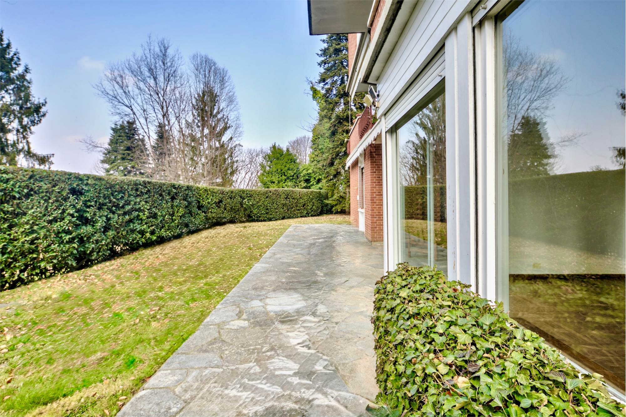 L'appartement, d'environ 330 mètres carrés, se distingue par la luminosité des pièces et la distribution harmonieuse des espaces. Le cœur de la maison est un grand salon double avec cheminée, agrémenté de larges ouvertures sur le magnifique jardin plat privé, parfait pour des moments de détente, de réception et de convivialité. La zone jour est complétée par une salle à manger et une grande cuisine moderne, éventuellement meublée.