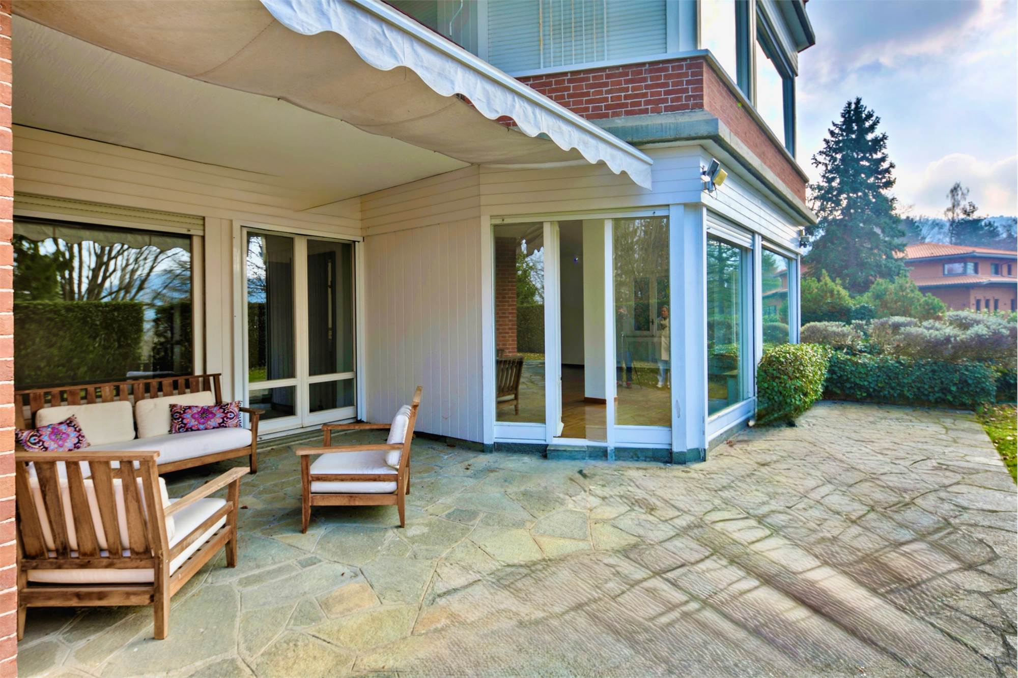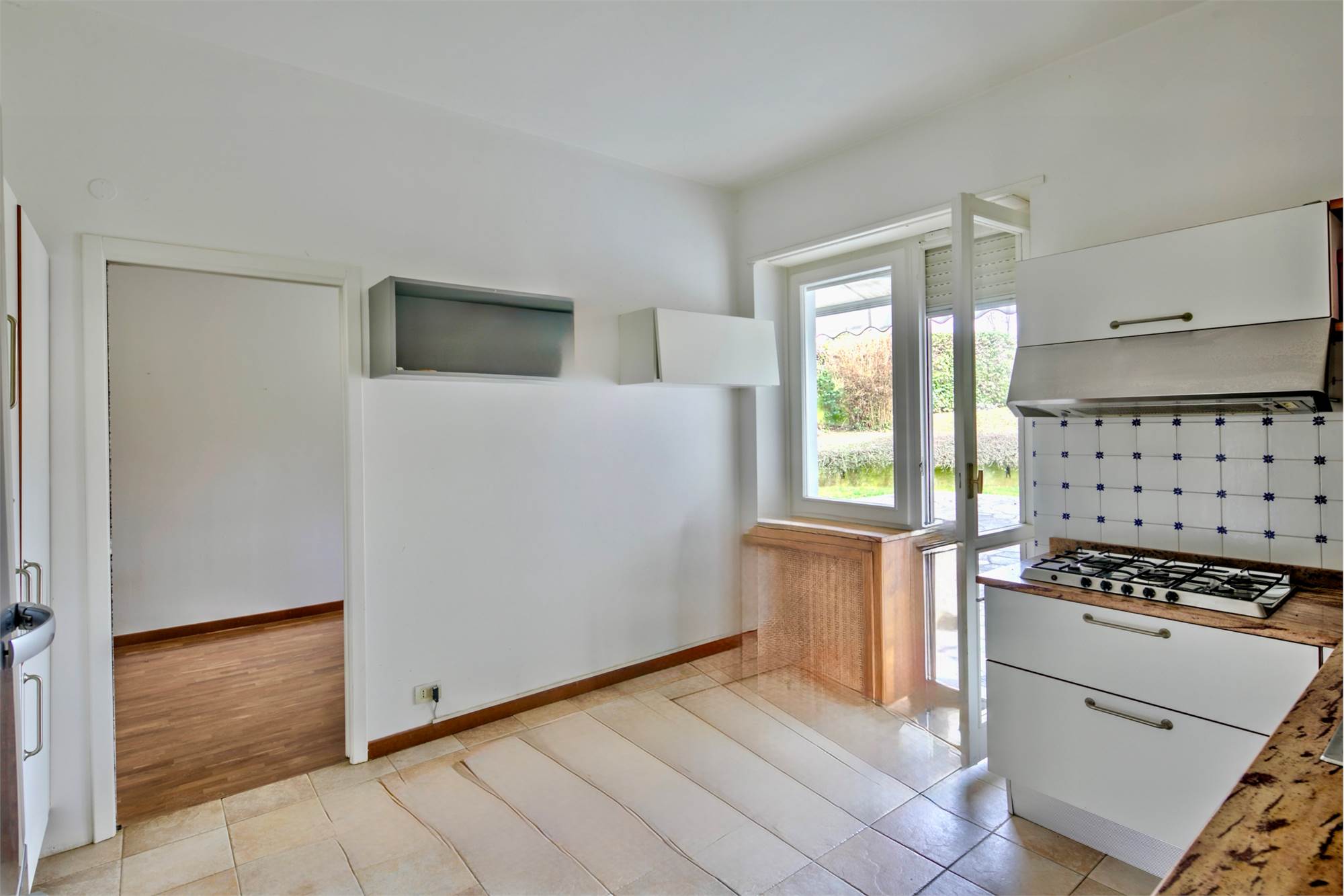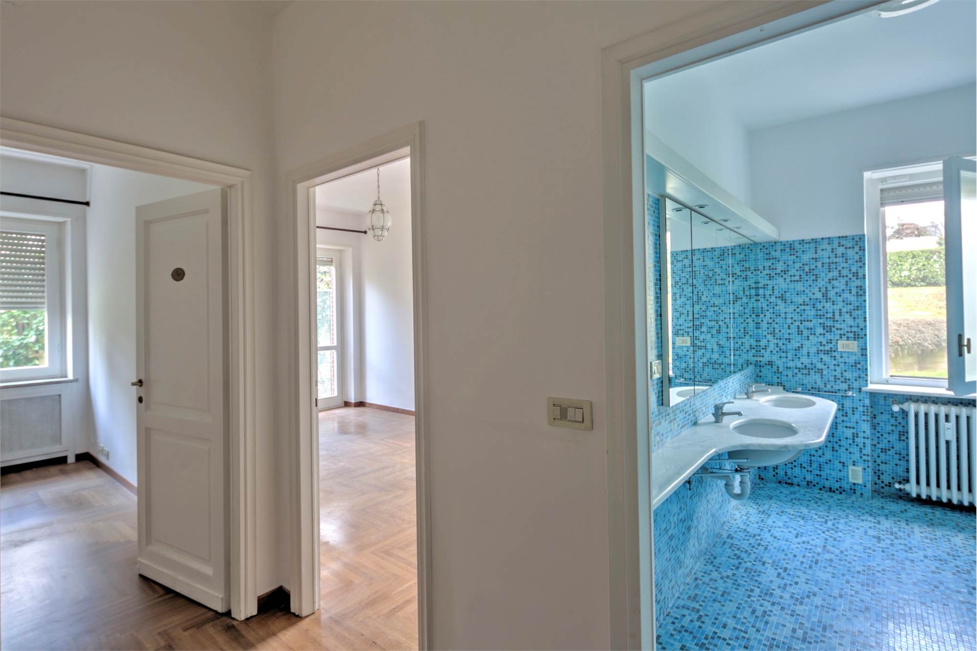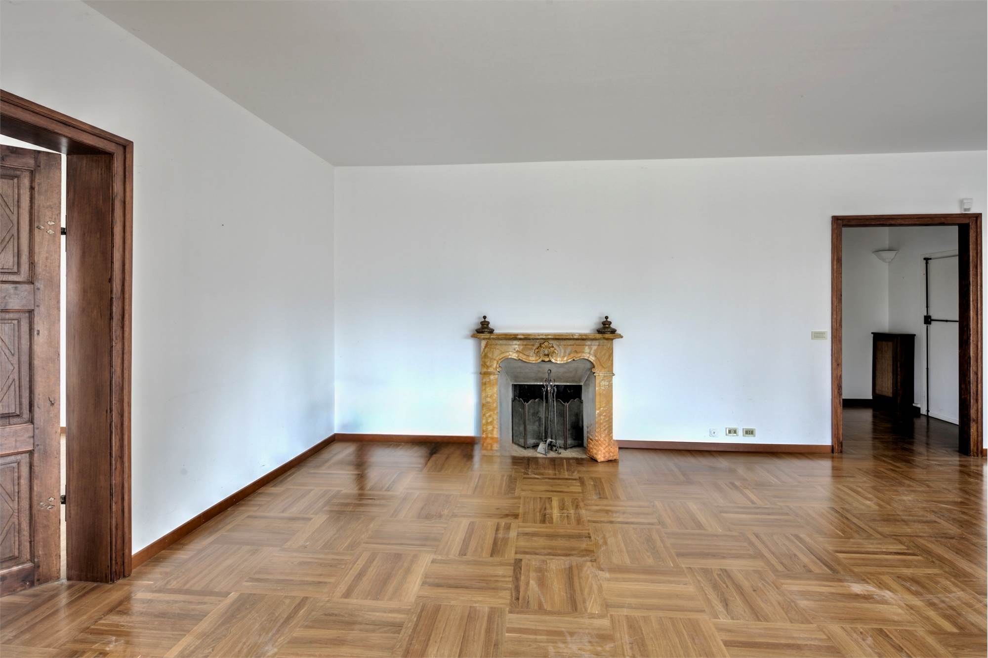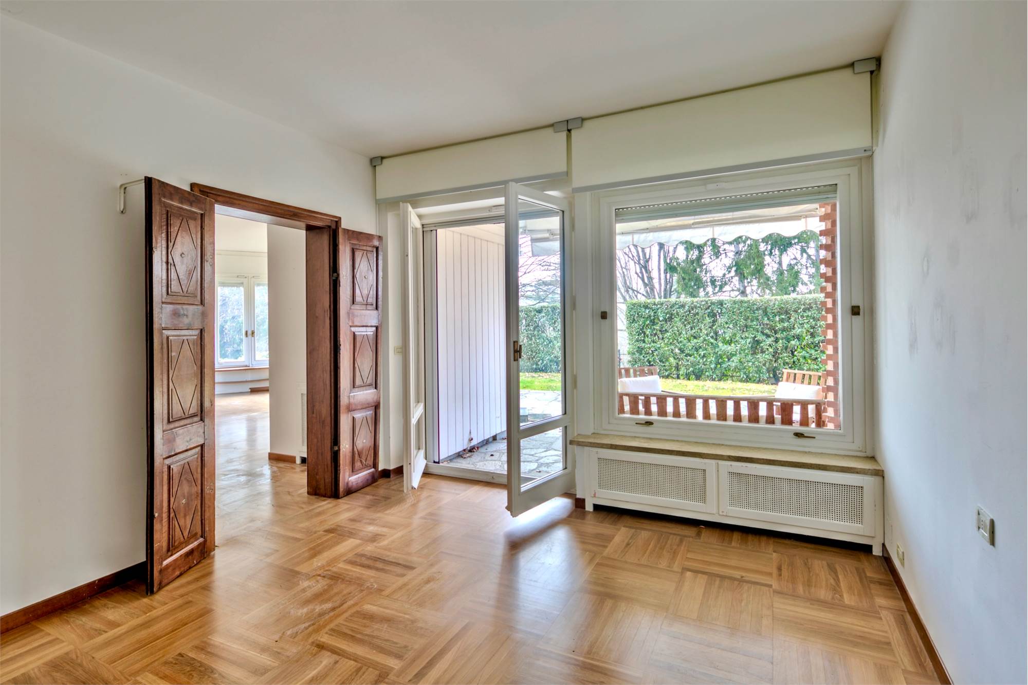L'appartement, d'environ 330 mètres carrés, se distingue par la luminosité des pièces et la distribution harmonieuse des espaces. Le cœur de la maison est un grand salon double avec cheminée, agrémenté de larges ouvertures sur le magnifique jardin plat privé, parfait pour des moments de détente, de réception et de convivialité. La zone jour est complétée par une salle à manger et une grande cuisine moderne, éventuellement meublée.