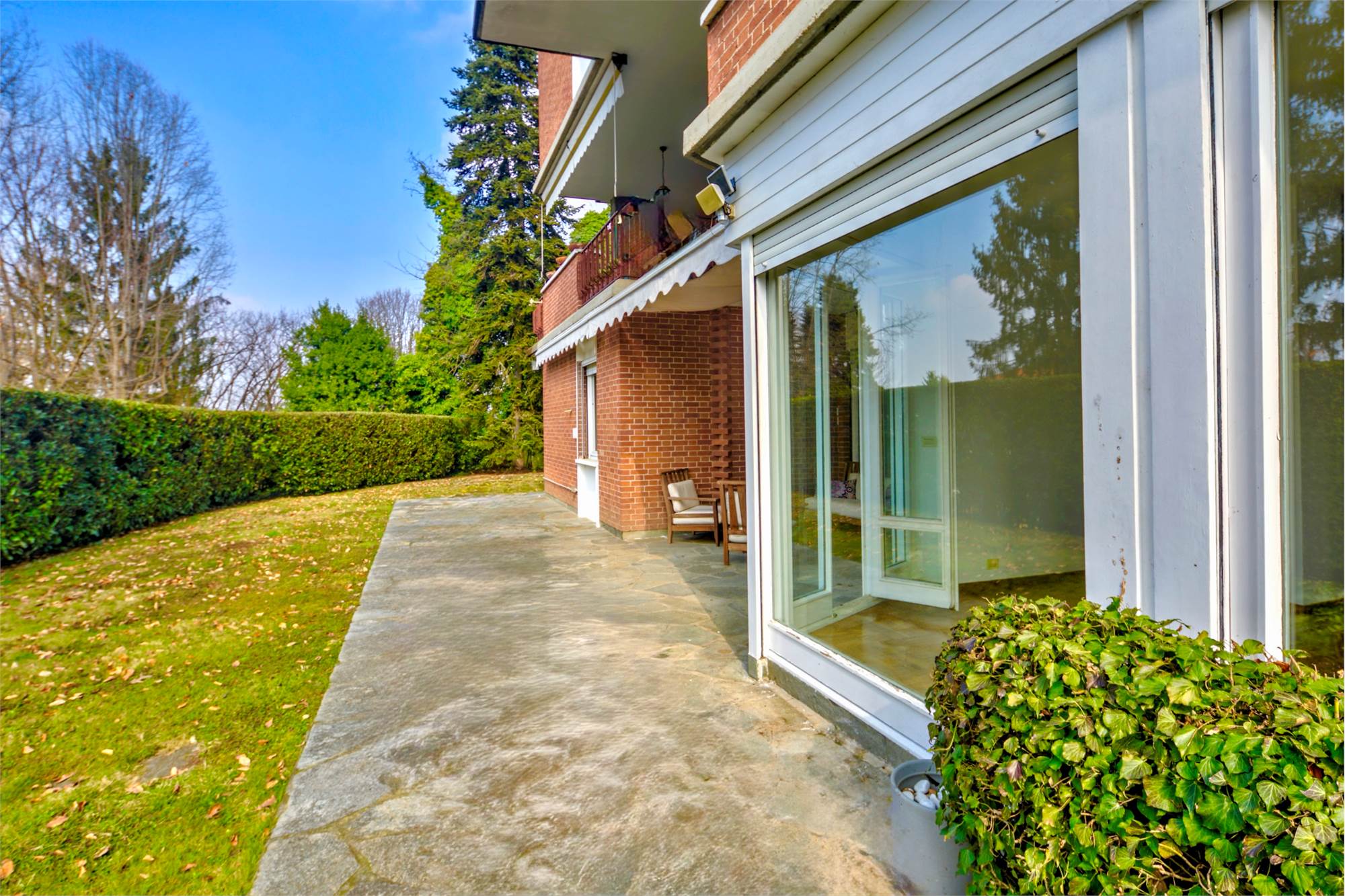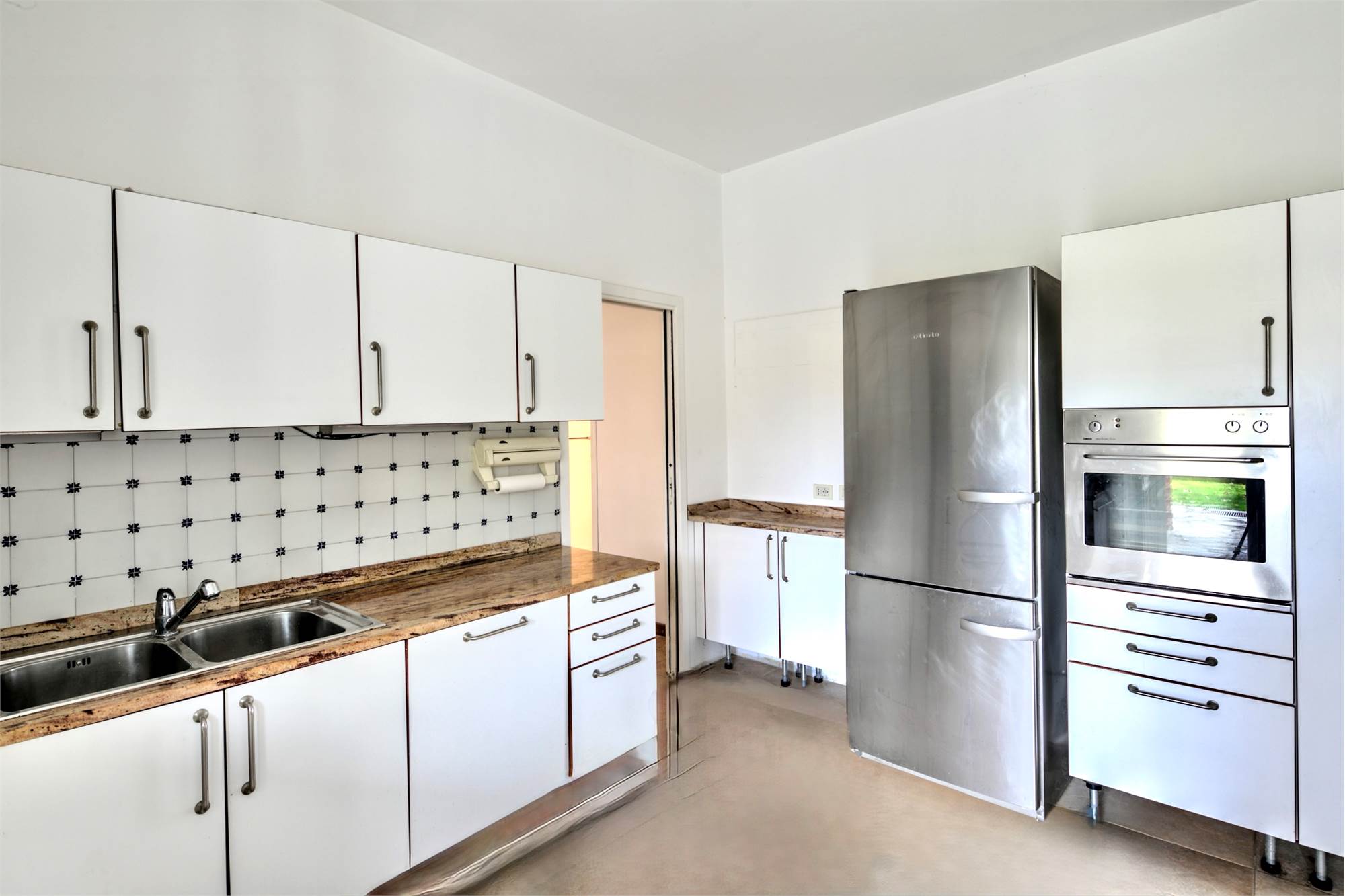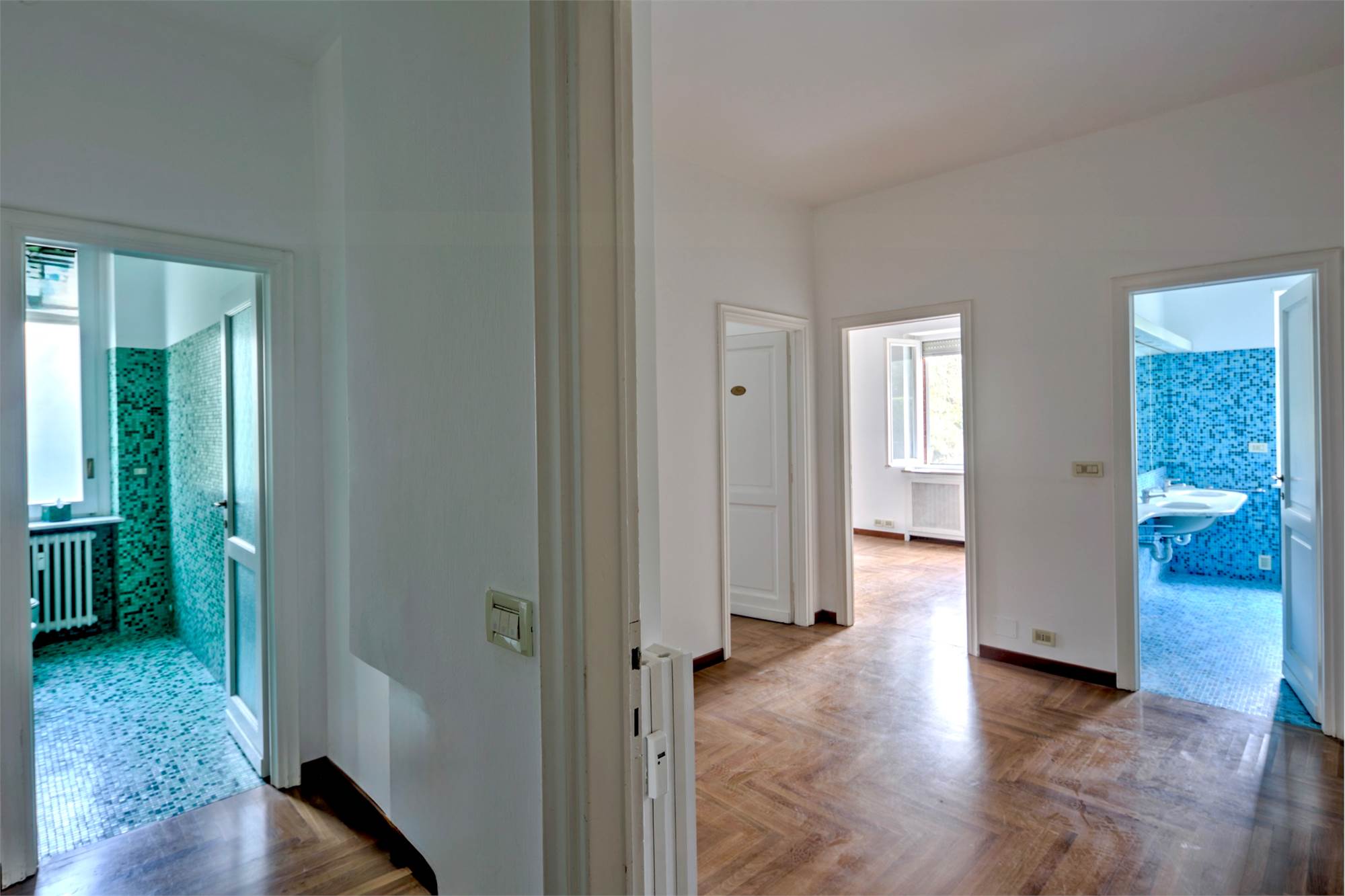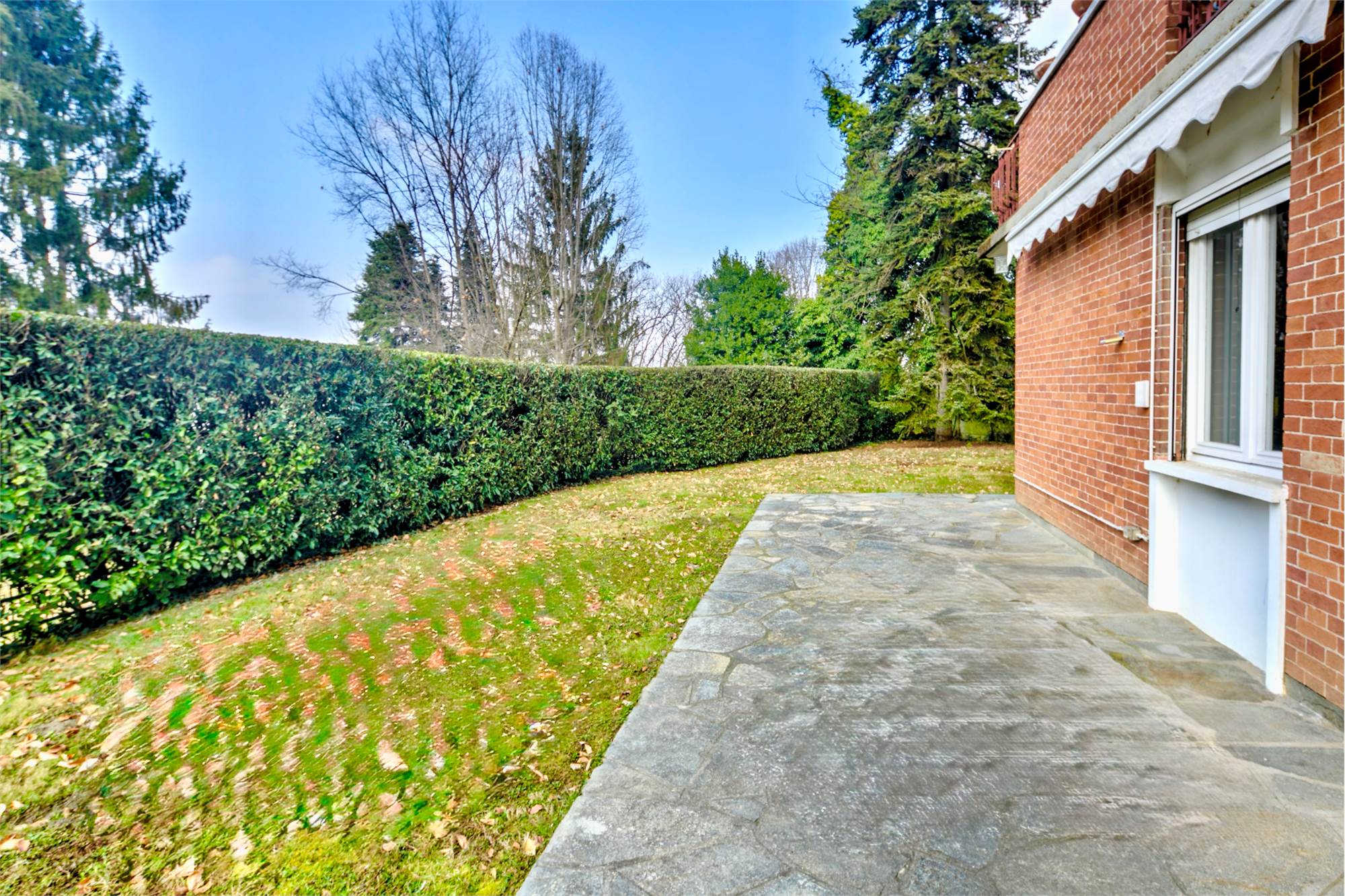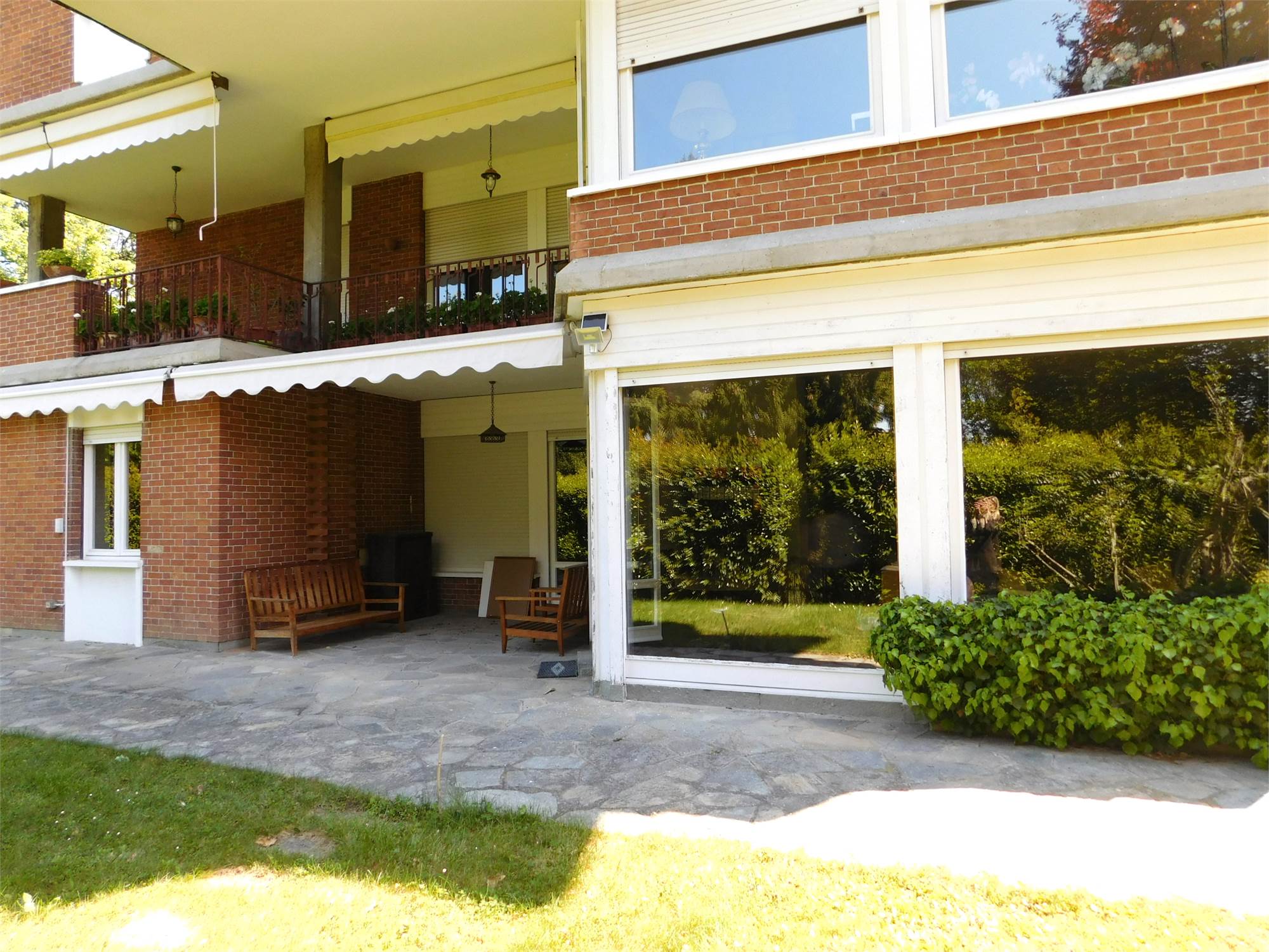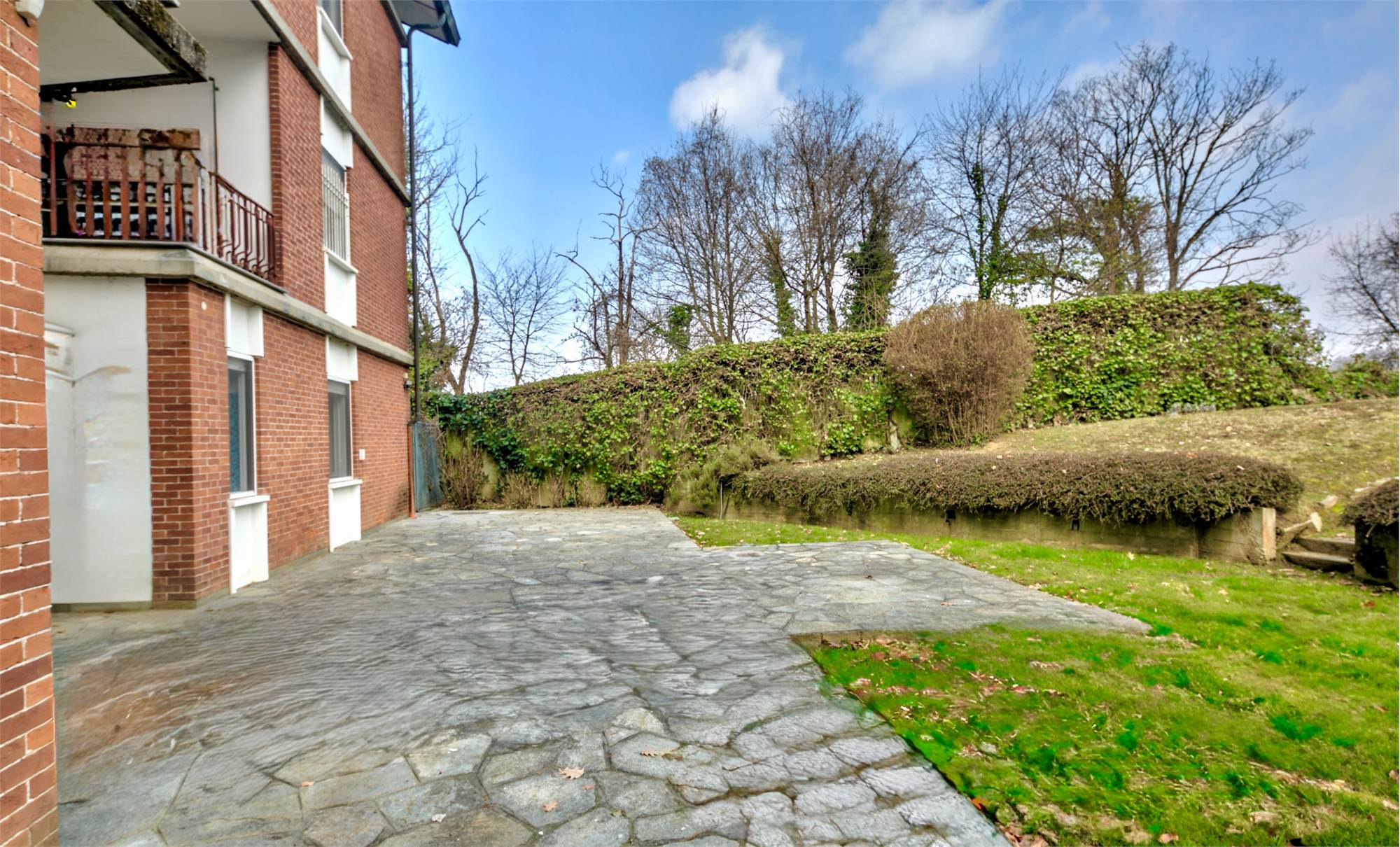 L'appartement, d'environ 330 mètres carrés, se distingue par la luminosité des pièces et la distribution harmonieuse des espaces. Le cœur de la maison est un grand salon double avec cheminée, agrémenté de larges ouvertures sur le magnifique jardin plat privé, parfait pour des moments de détente, de réception et de convivialité. La zone jour est complétée par une salle à manger et une grande cuisine moderne, éventuellement meublée.