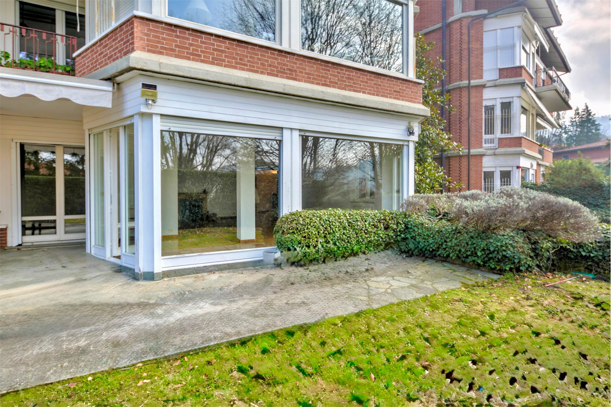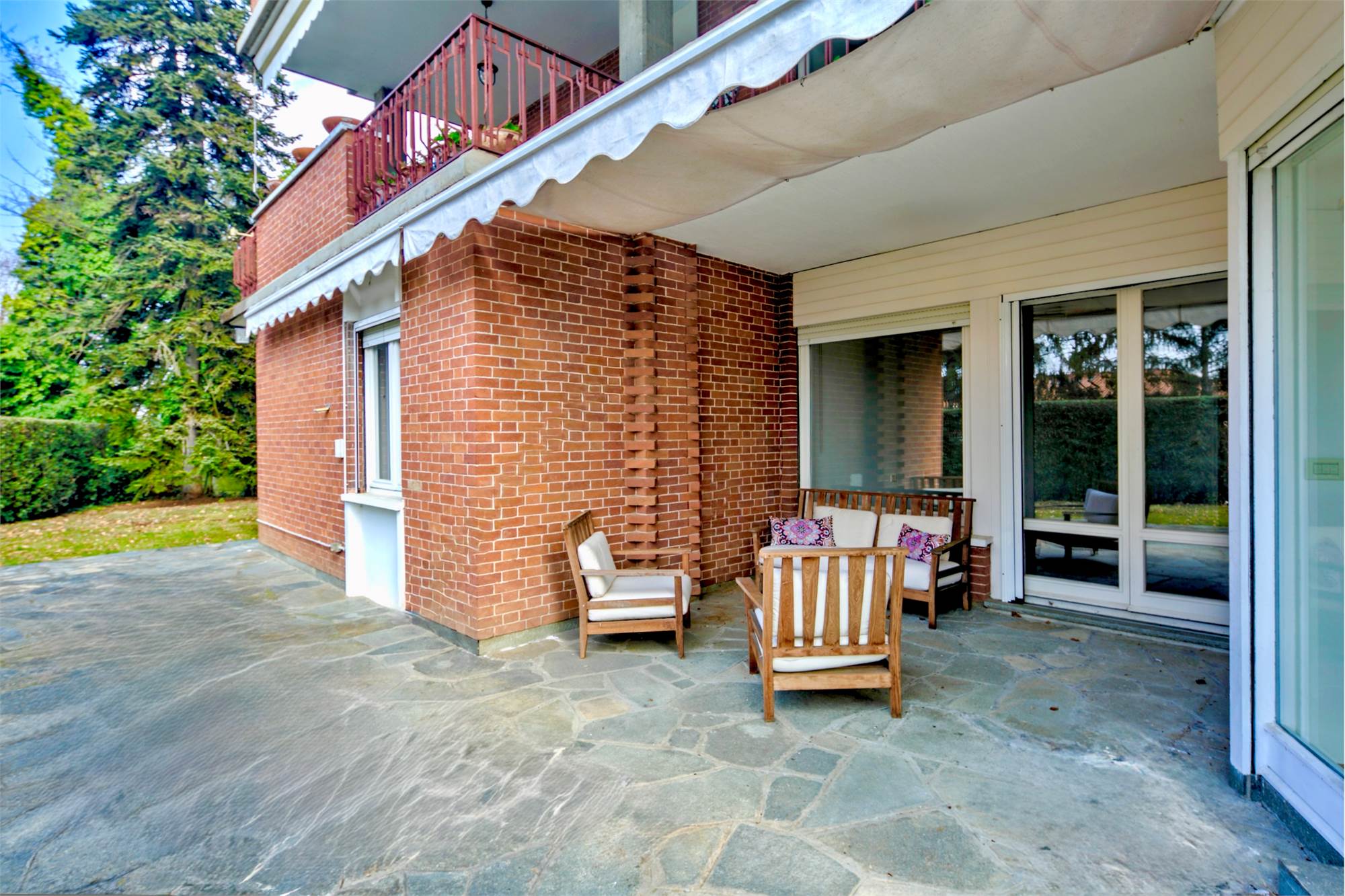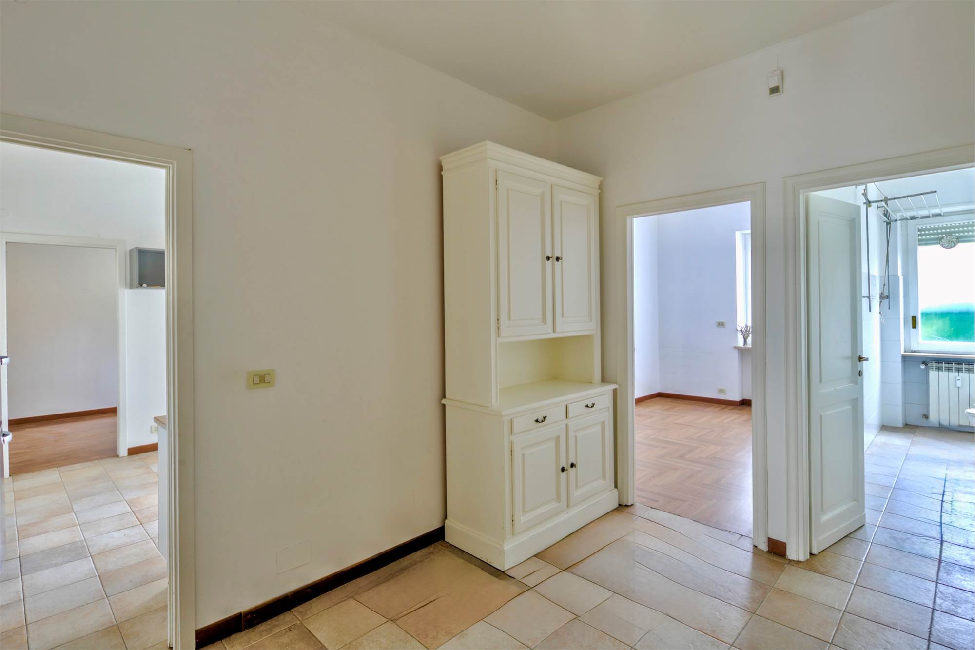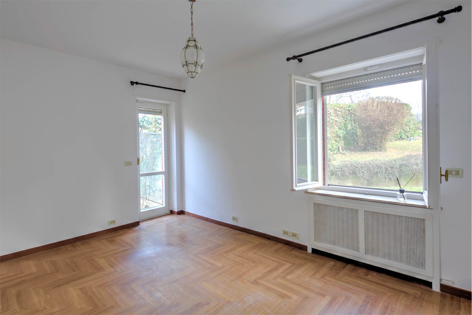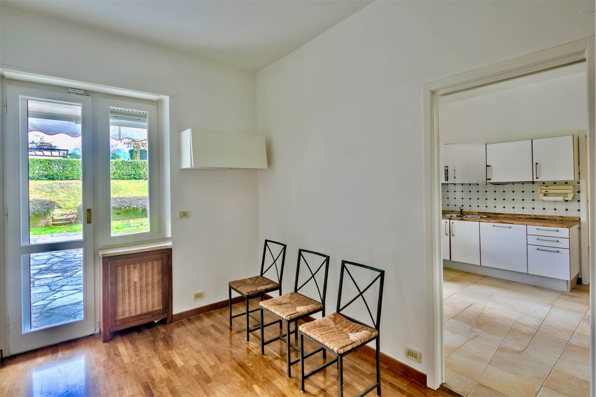 L'appartement, d'environ 330 mètres carrés, se distingue par la luminosité des pièces et la distribution harmonieuse des espaces. Le cœur de la maison est un grand salon double avec cheminée, agrémenté de larges ouvertures sur le magnifique jardin plat privé, parfait pour des moments de détente, de réception et de convivialité. La zone jour est complétée par une salle à manger et une grande cuisine moderne, éventuellement meublée.