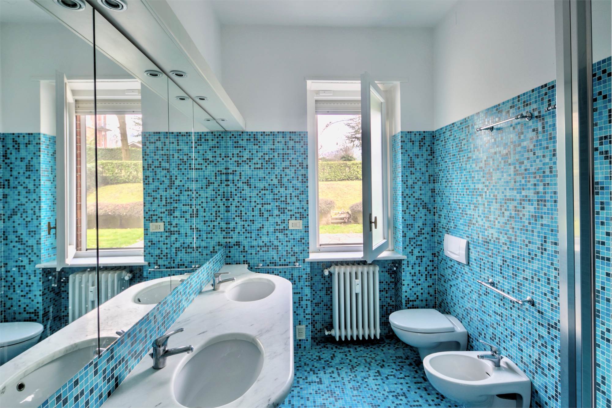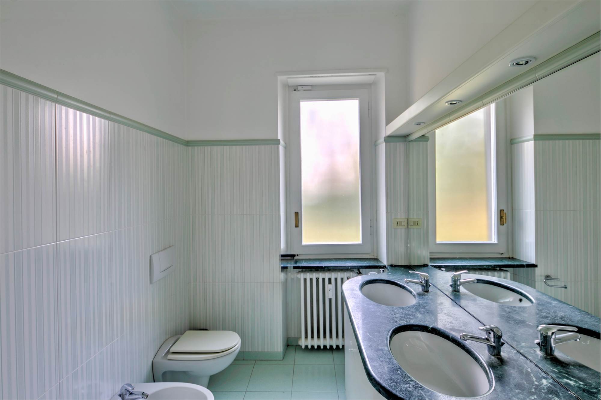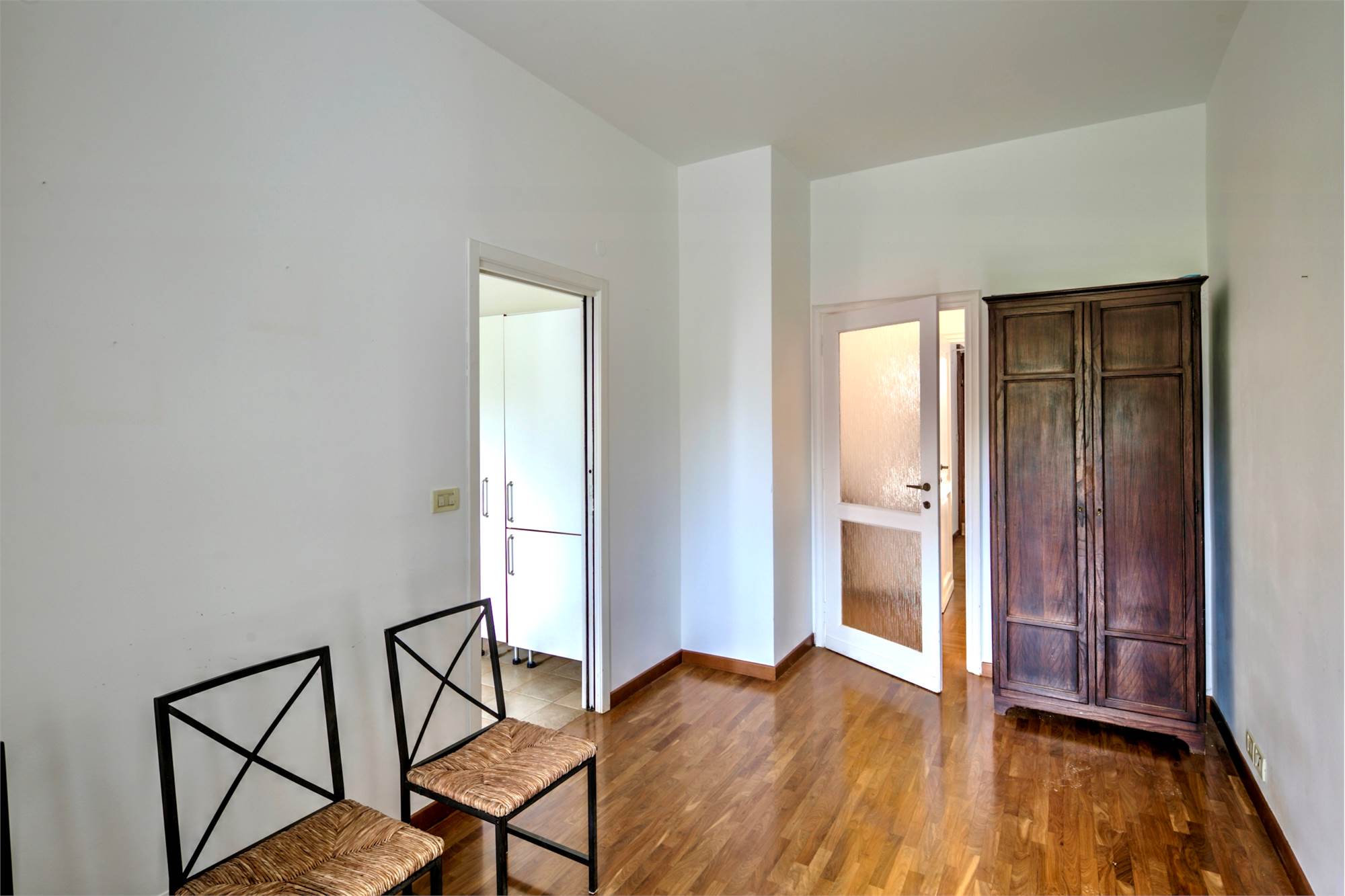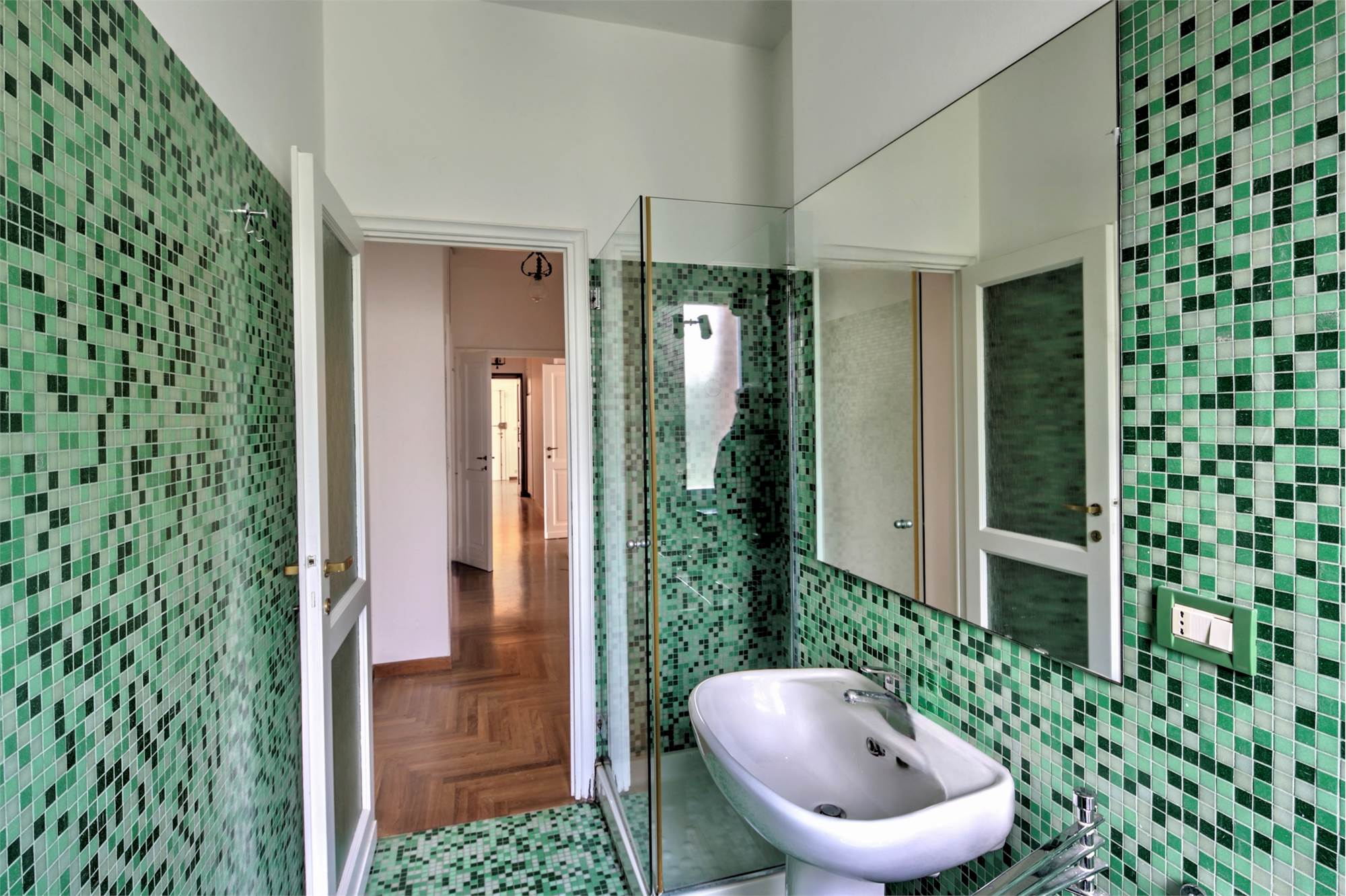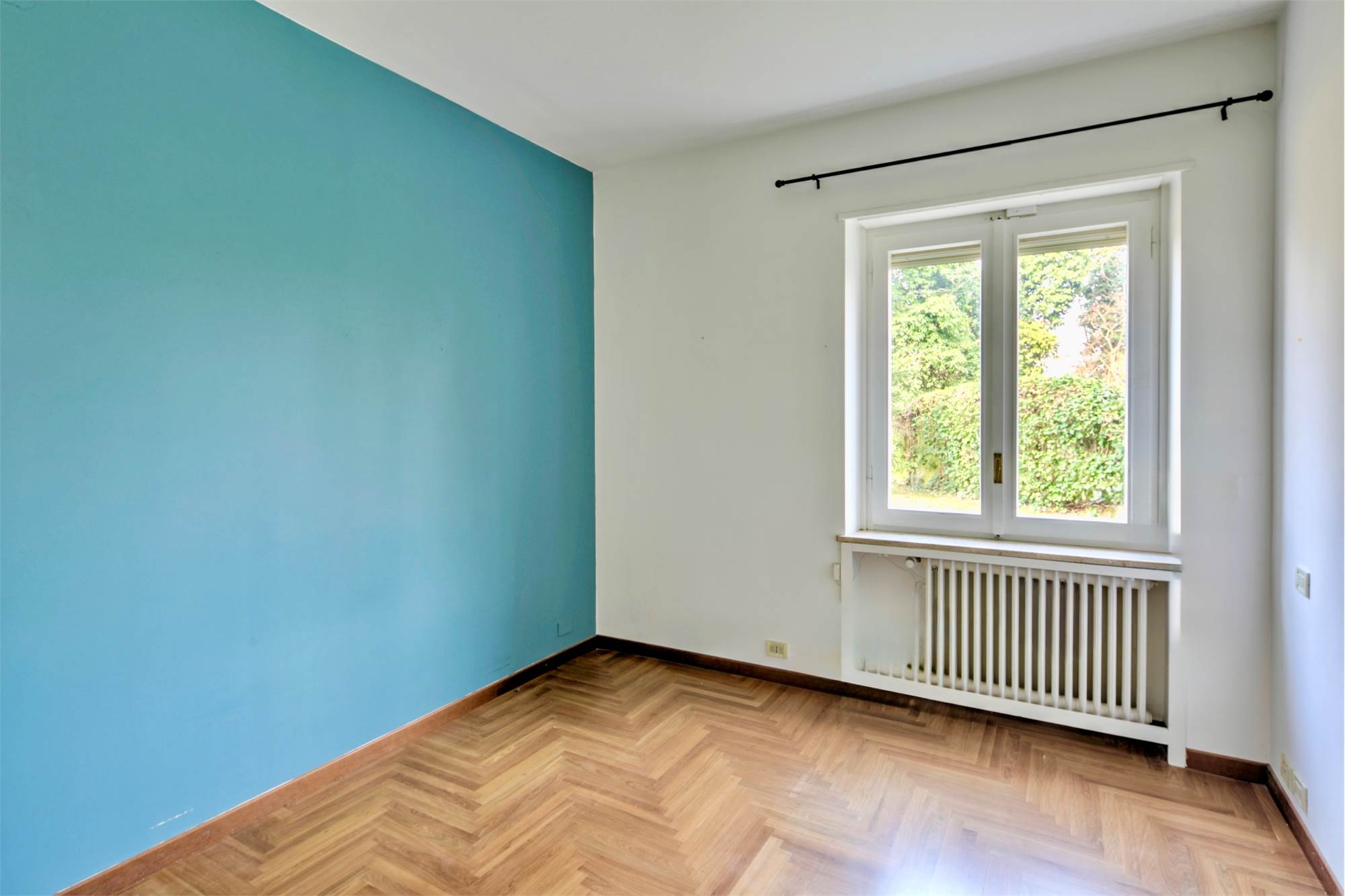 L'appartement, d'environ 330 mètres carrés, se distingue par la luminosité des pièces et la distribution harmonieuse des espaces. Le cœur de la maison est un grand salon double avec cheminée, agrémenté de larges ouvertures sur le magnifique jardin plat privé, parfait pour des moments de détente, de réception et de convivialité. La zone jour est complétée par une salle à manger et une grande cuisine moderne, éventuellement meublée.