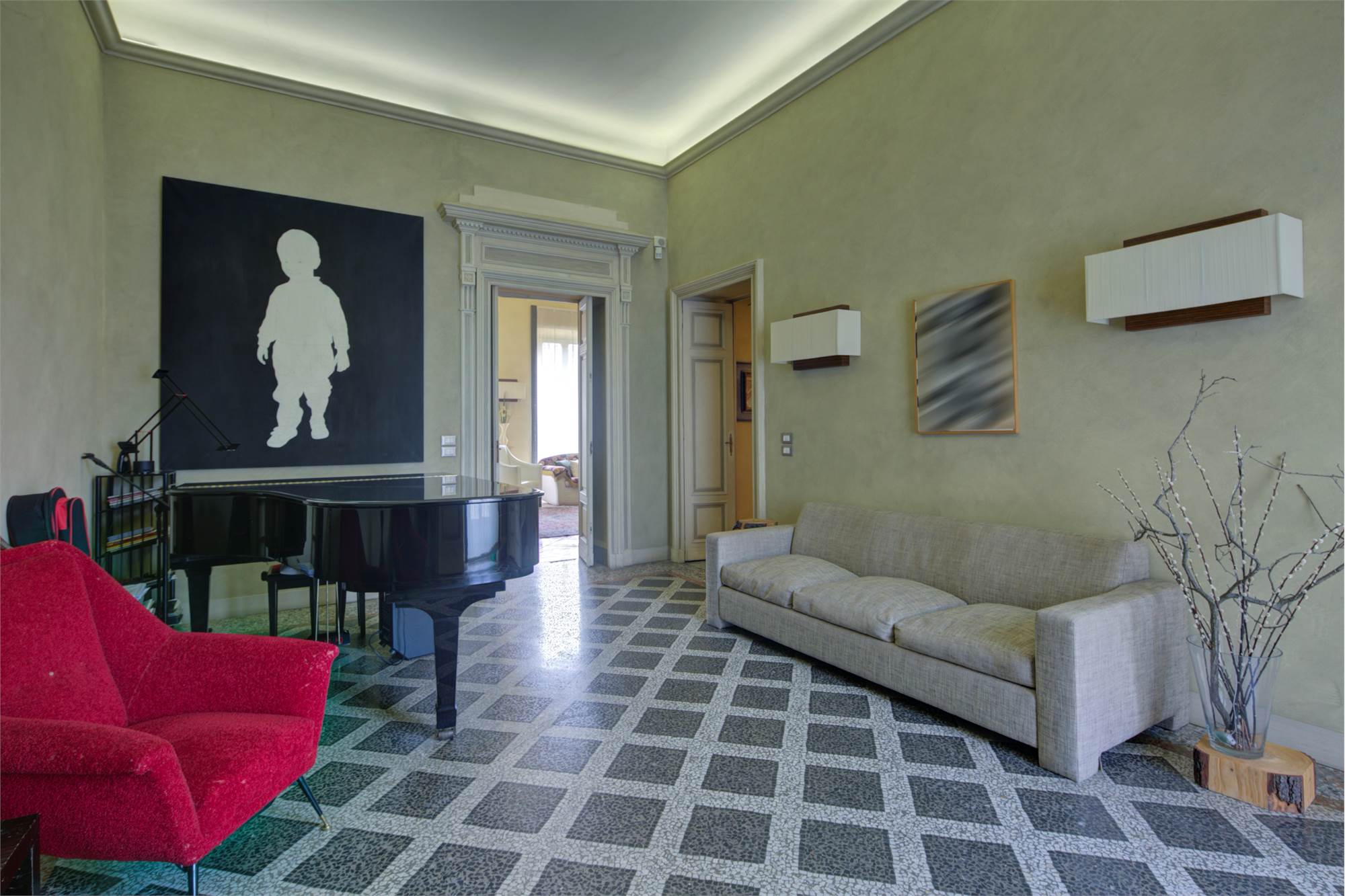 All'ingresso accediamo all'immobile da una sala della musica di grande fascino, seguita da salone, sala da pranzo, studio, bagno ospiti, cucina abitabile e lavanderia .