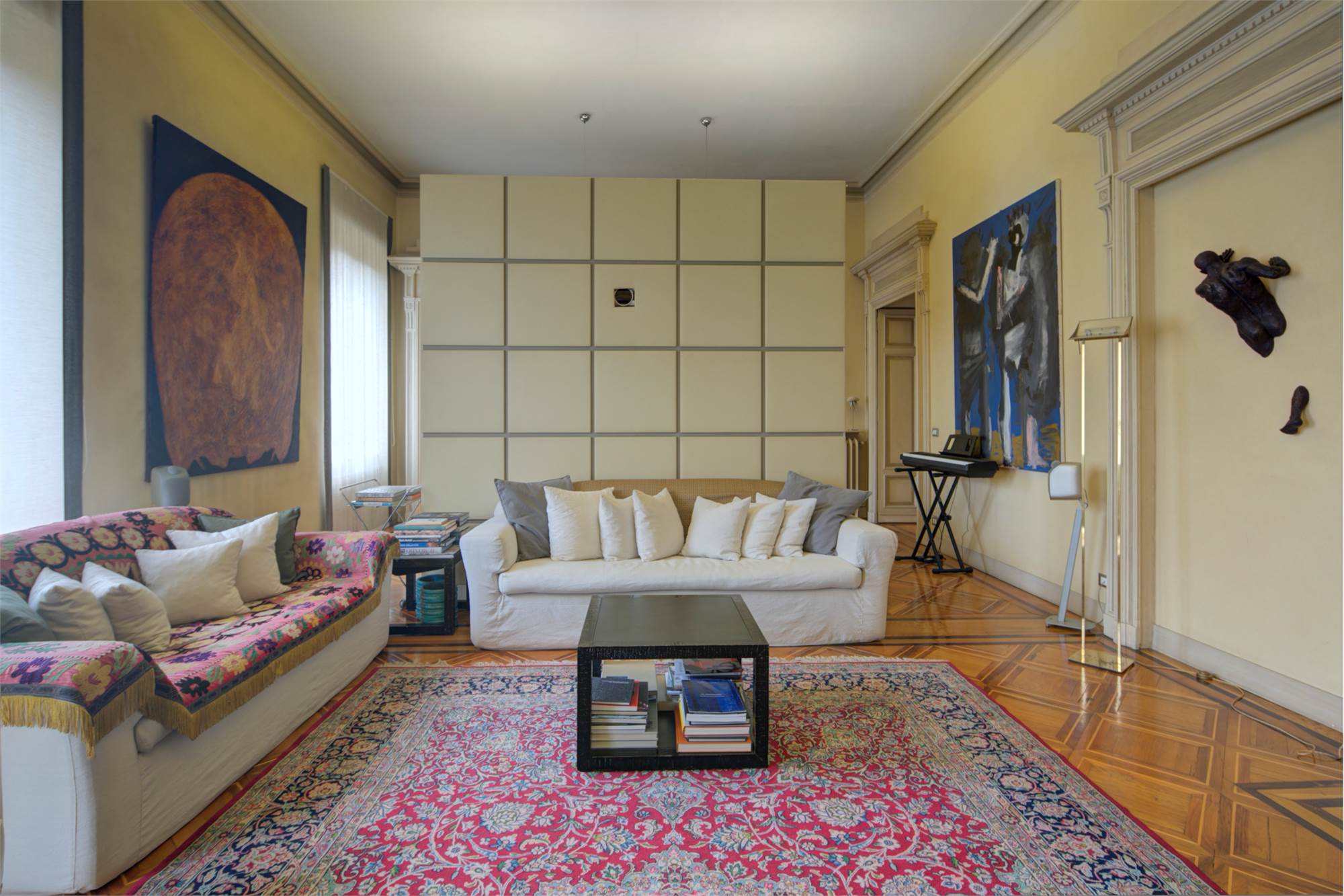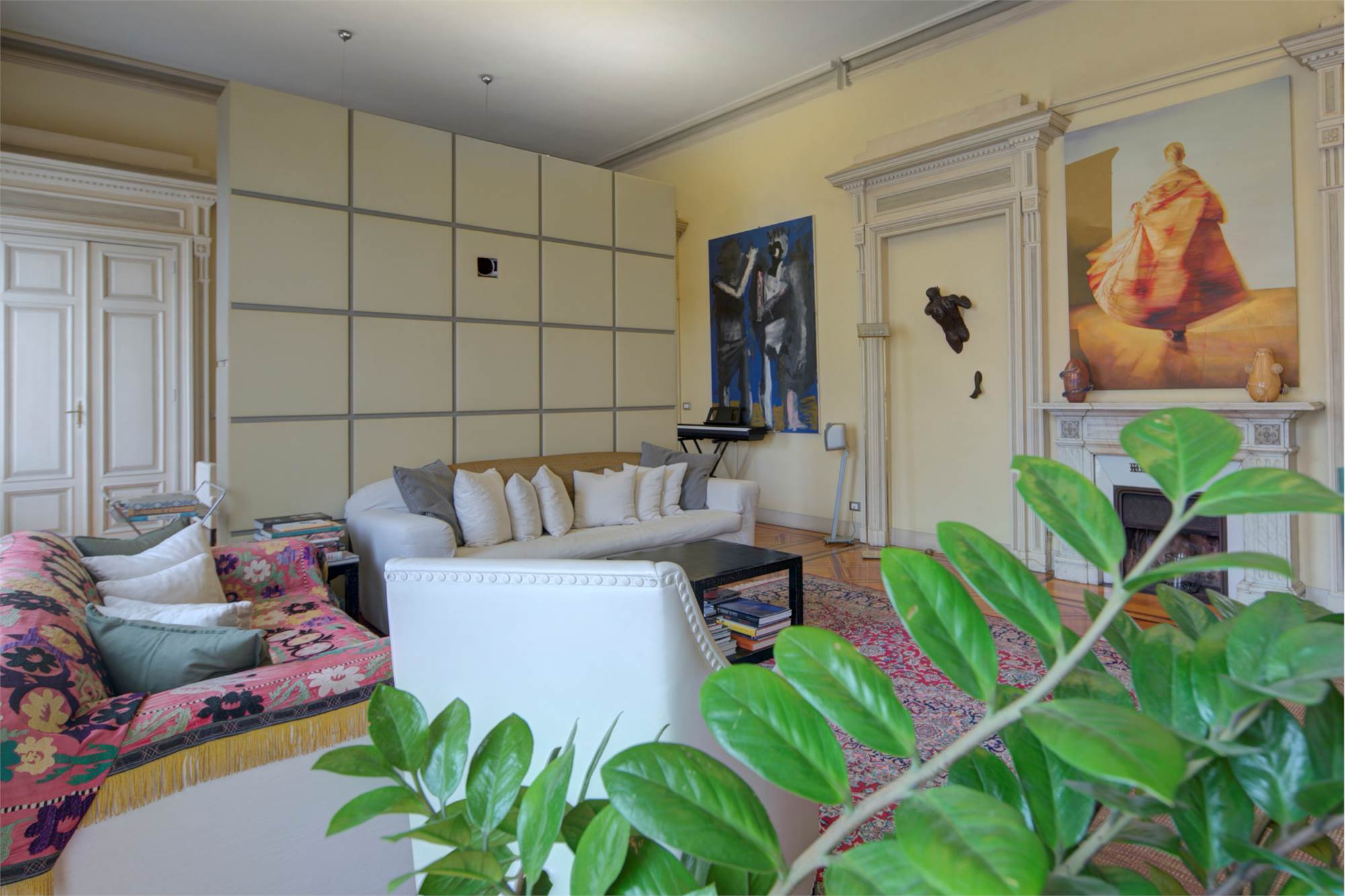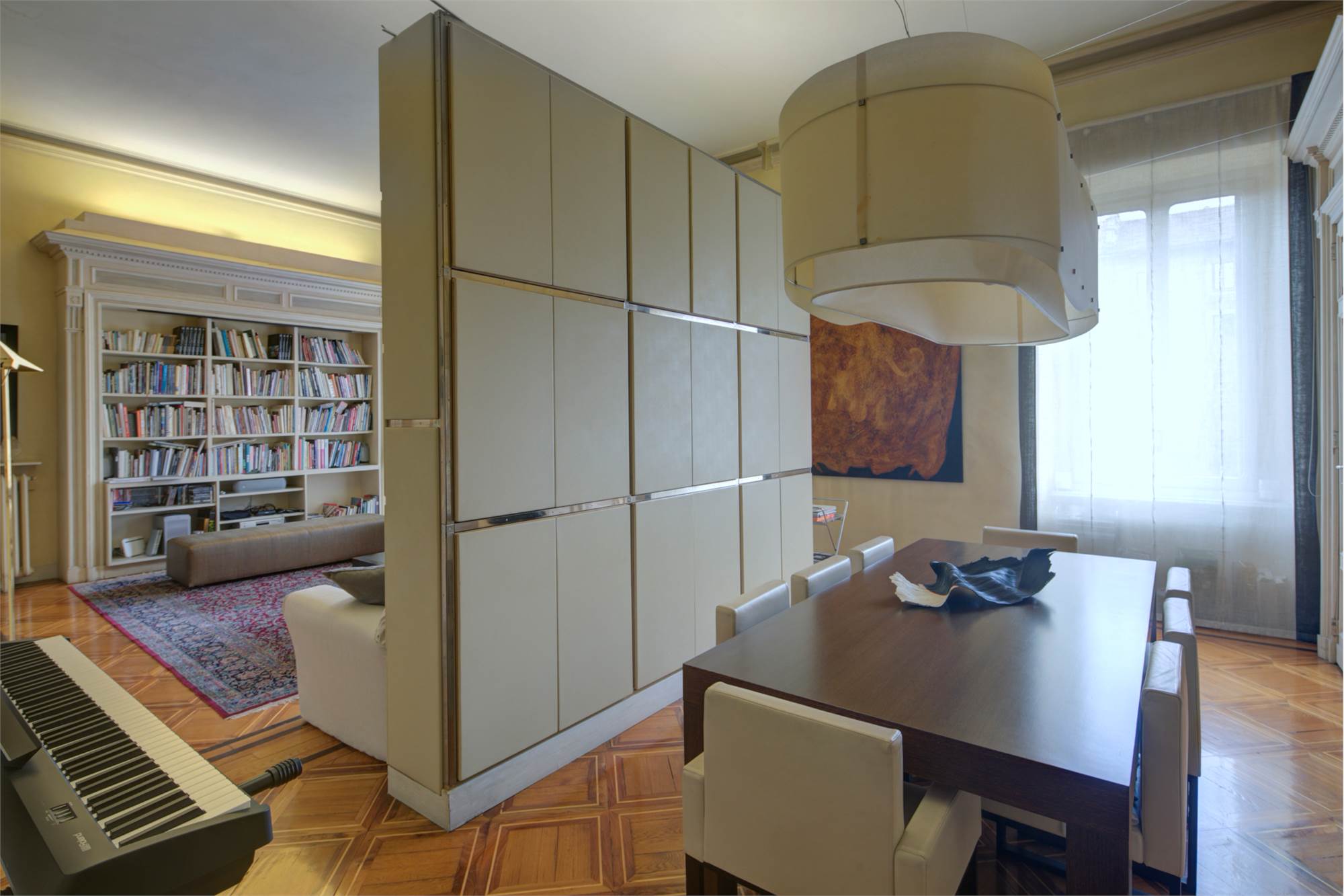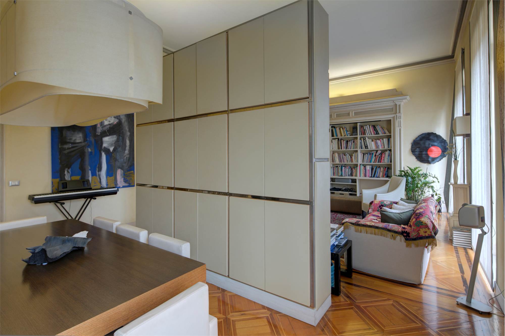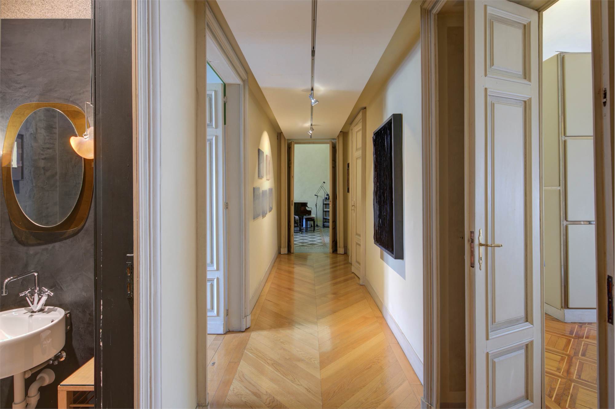 L’abitazione è caratterizzata da alti soffitti (4,30 mt) con tripla esposizione e da una straordinaria luminosità con scorci sulla Piazza Solferino.