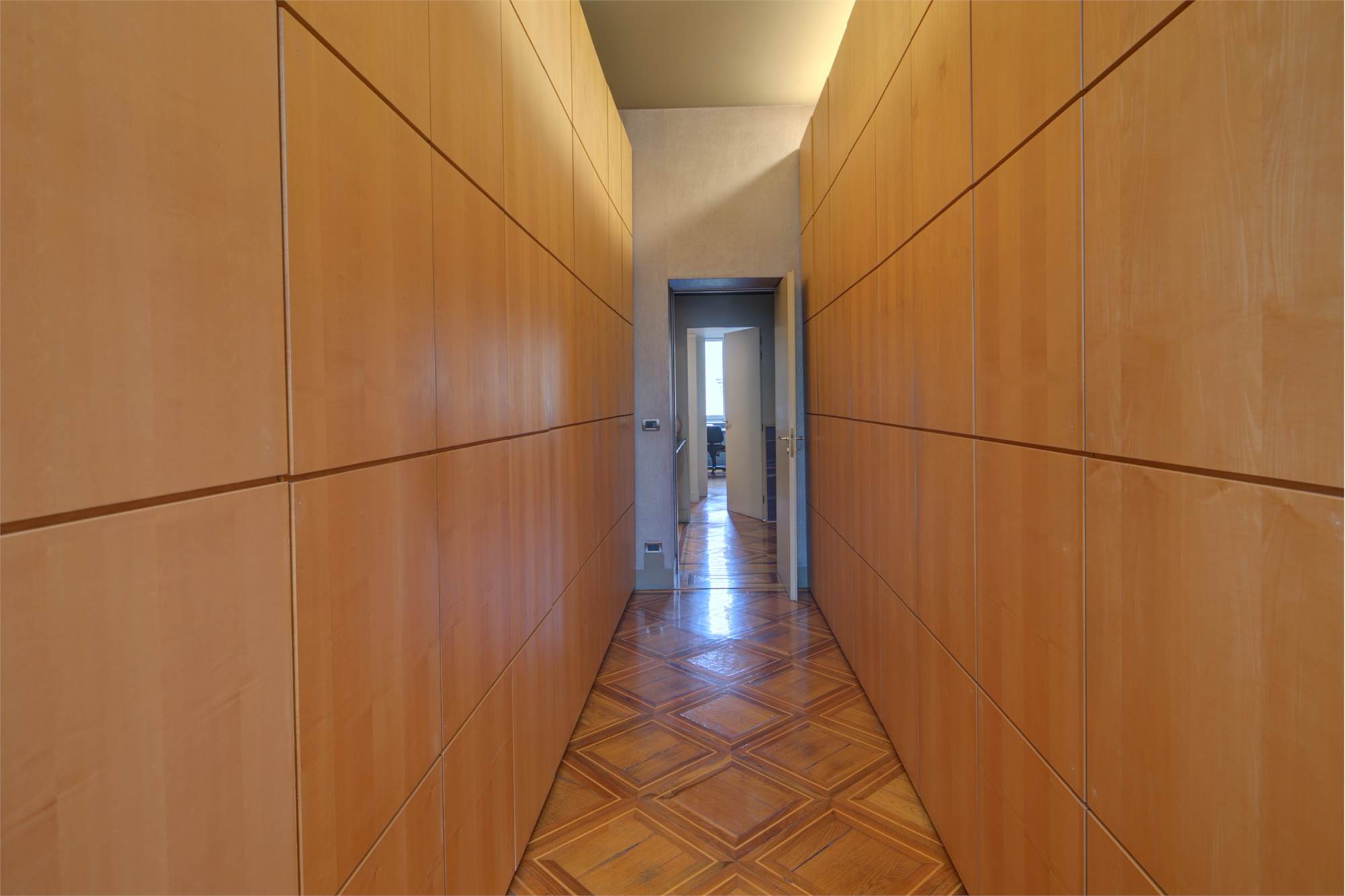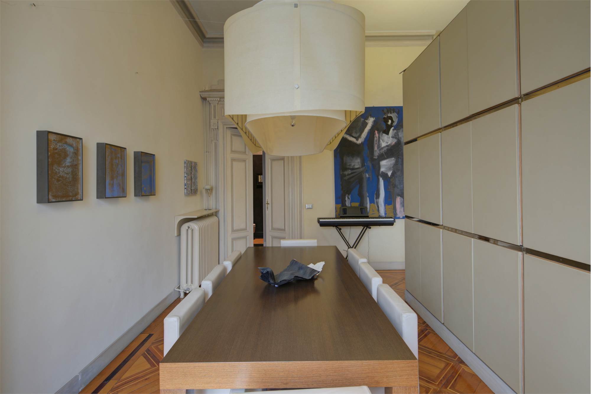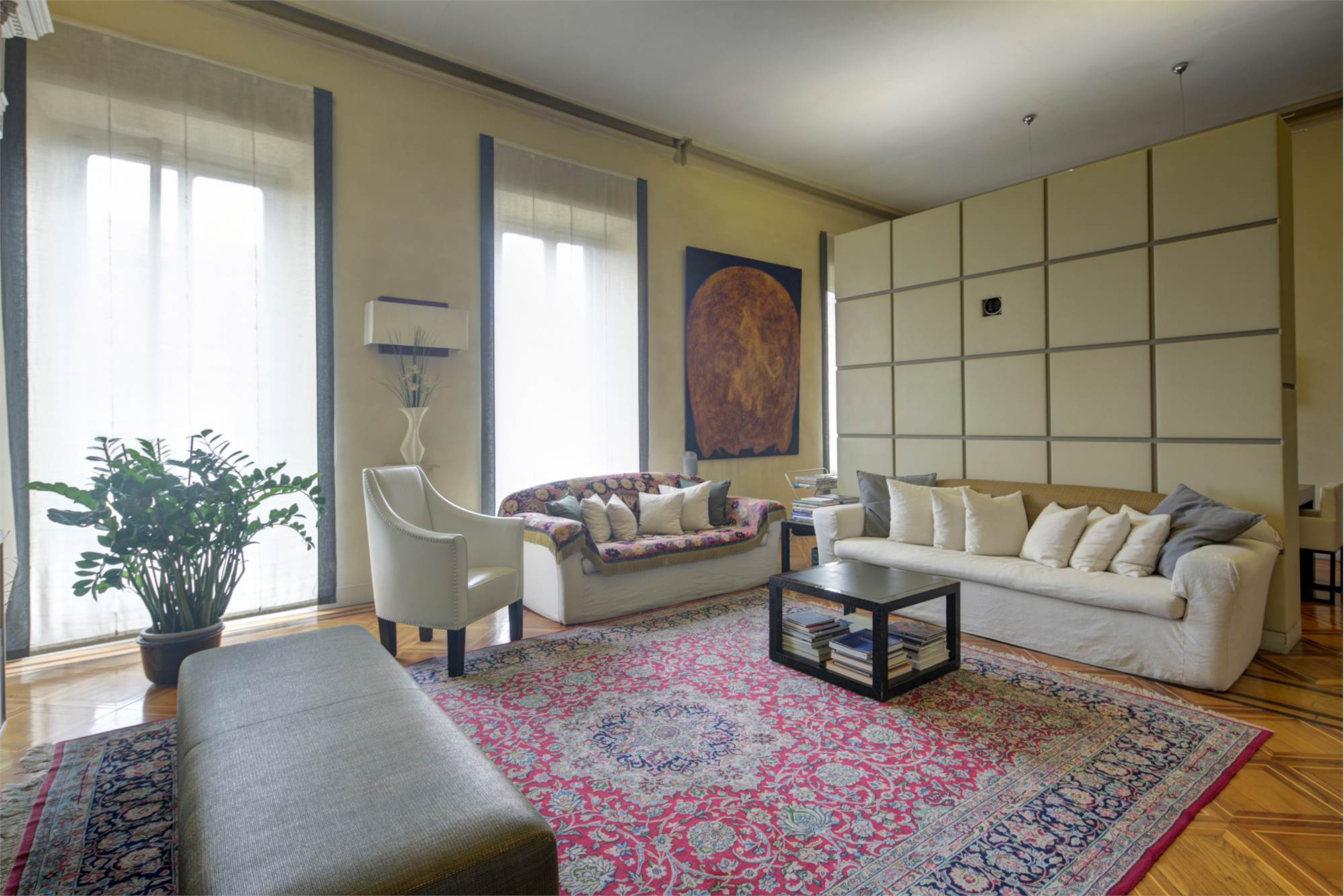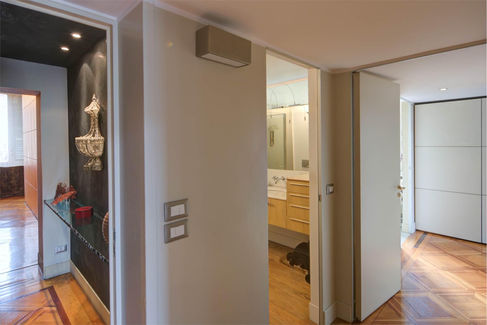 L’abitazione è caratterizzata da alti soffitti (4,30 mt) con tripla esposizione e da una straordinaria luminosità con scorci sulla Piazza Solferino.