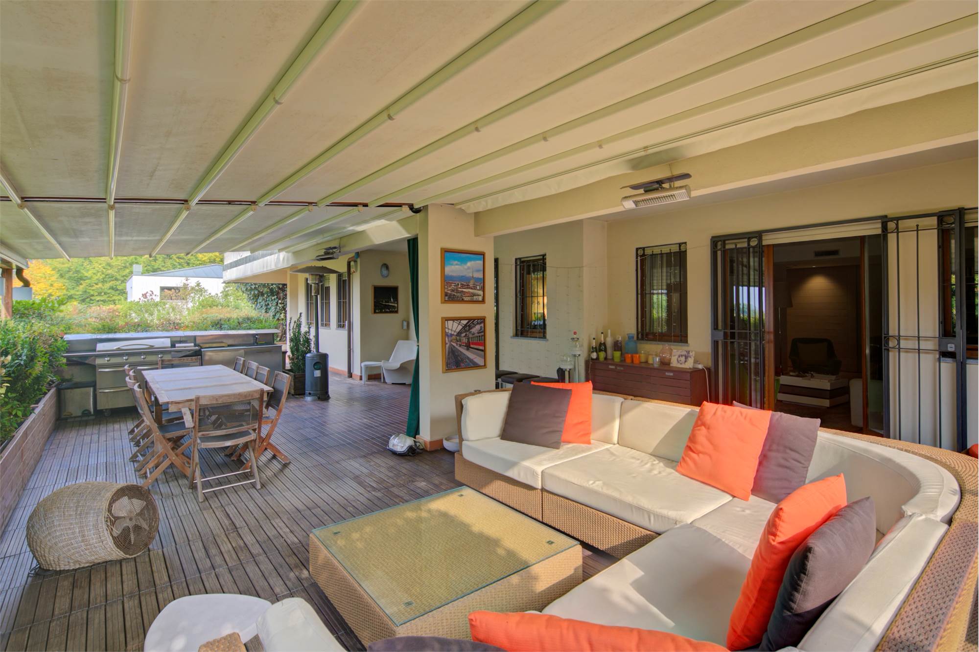 Ampio soggiorno con accesso diretto al terrazzo panoramico dotato di pergolato mobile, salotto esterno, barbecue, zona relax e zona pranzo