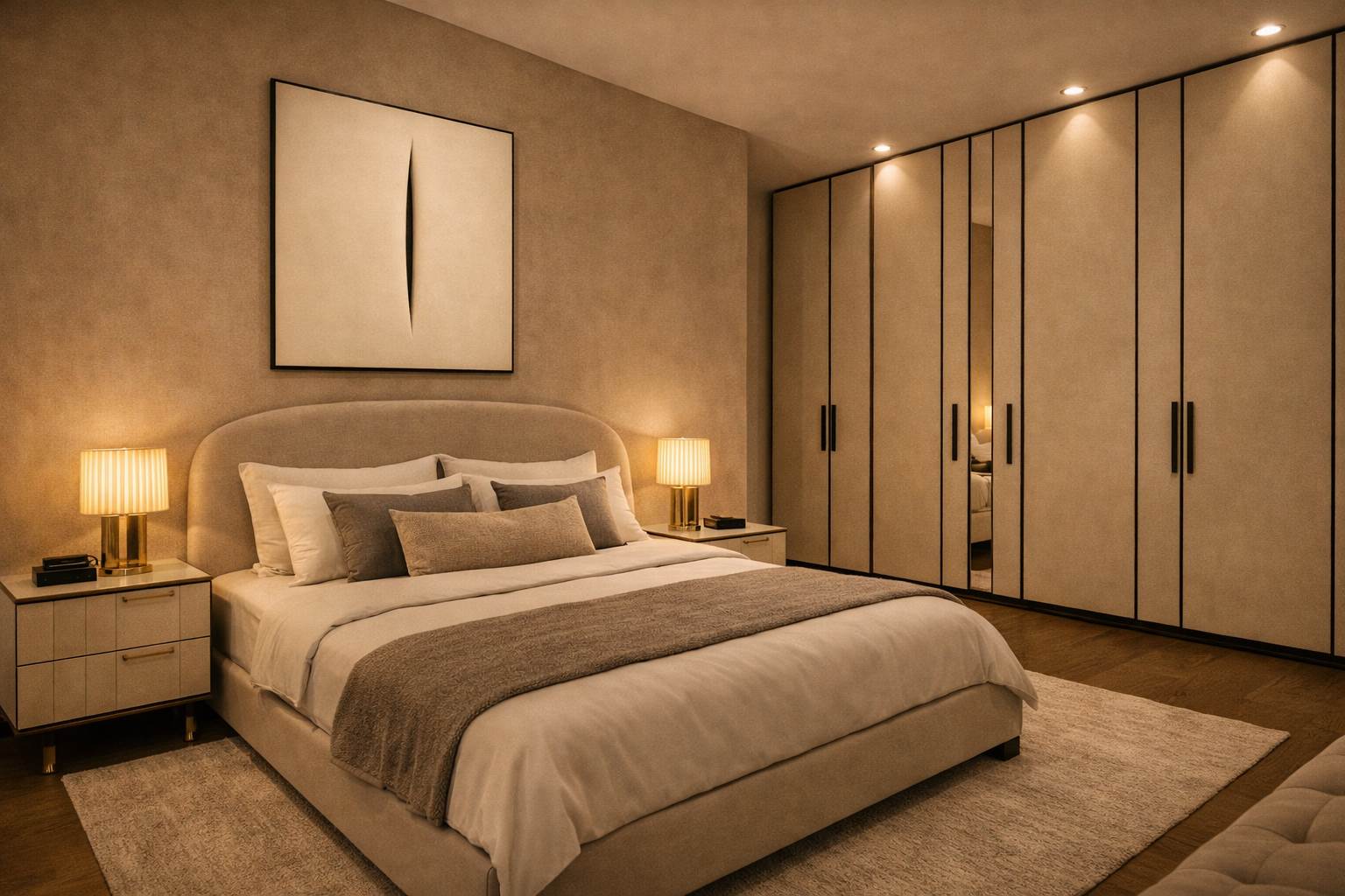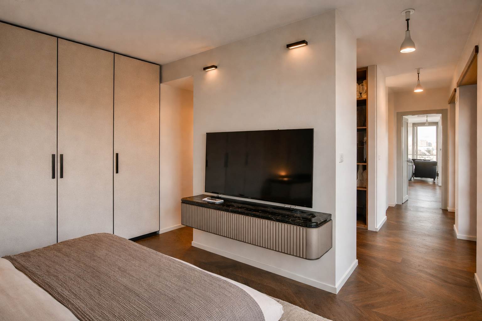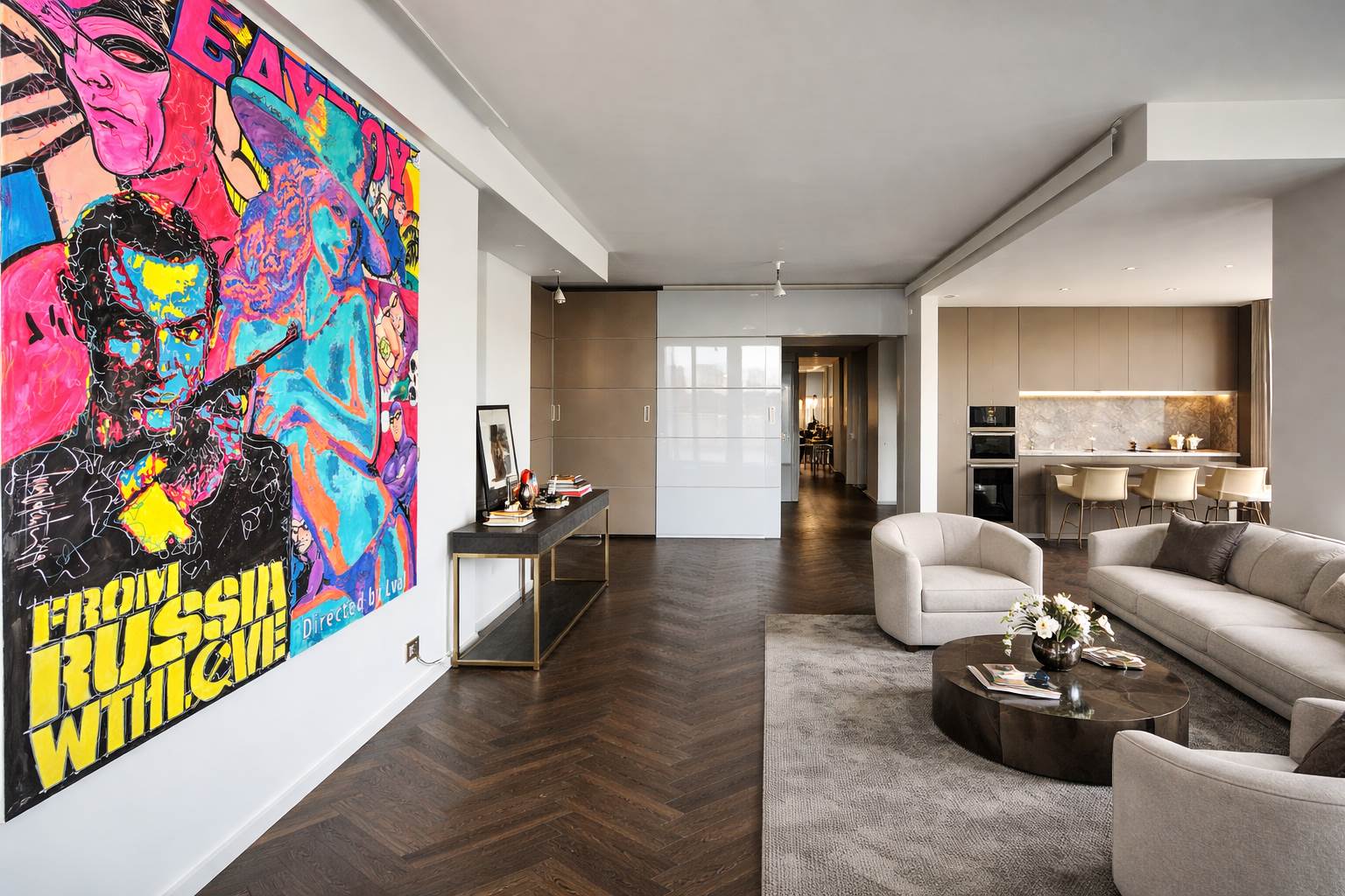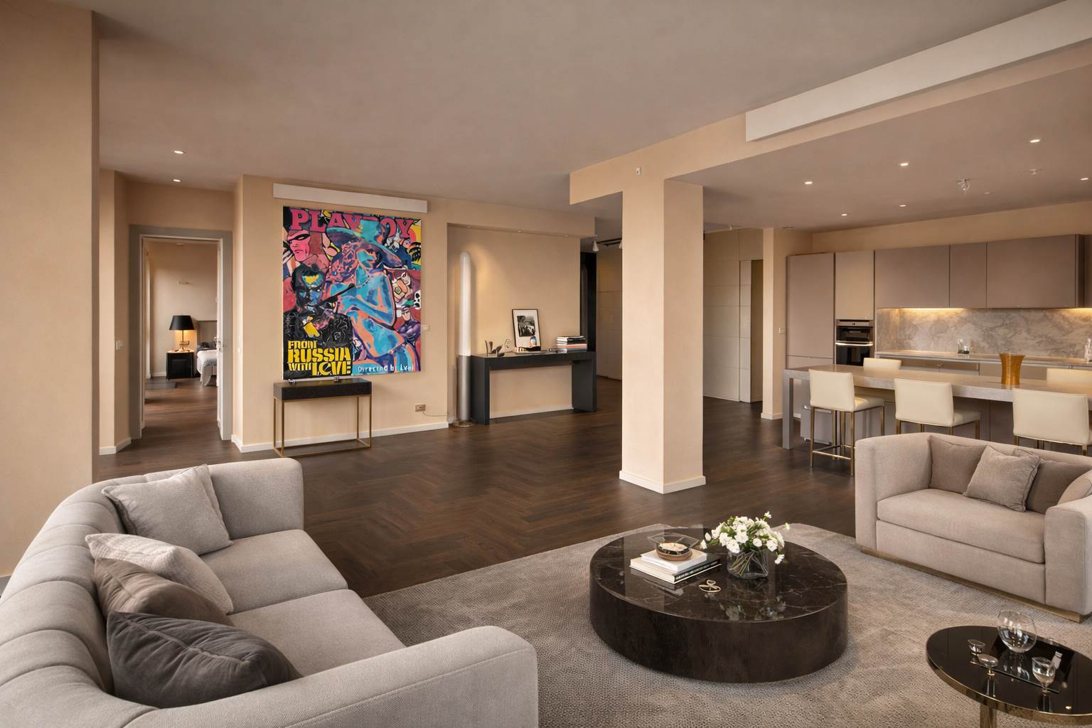L’alloggio è composto da ingresso su ampio salone living con zona cucina, due camere, cabina armadi, doppi servizi, sauna privata, lavanderia e disimpegni. Completa la proprietà una cantina.